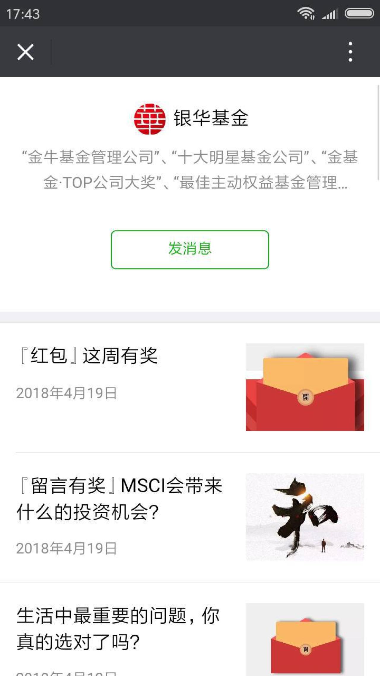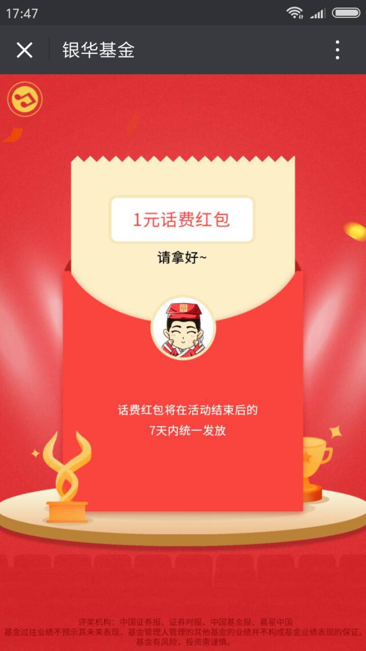 进入微信,点右上角+,添加朋友,公众号,关注 银华基金 后,点 右上角,查看历史消息,找到 红包,阅读原文,点 独乐乐不如众乐乐,在10秒内,回答多选器,答案依次为 ABC,ABCD,ABC,A,B,C,最后选是较高风险基金。可领取1元话费红包或微信红包,小希领到了1元话费,活动结束后7天内发放。