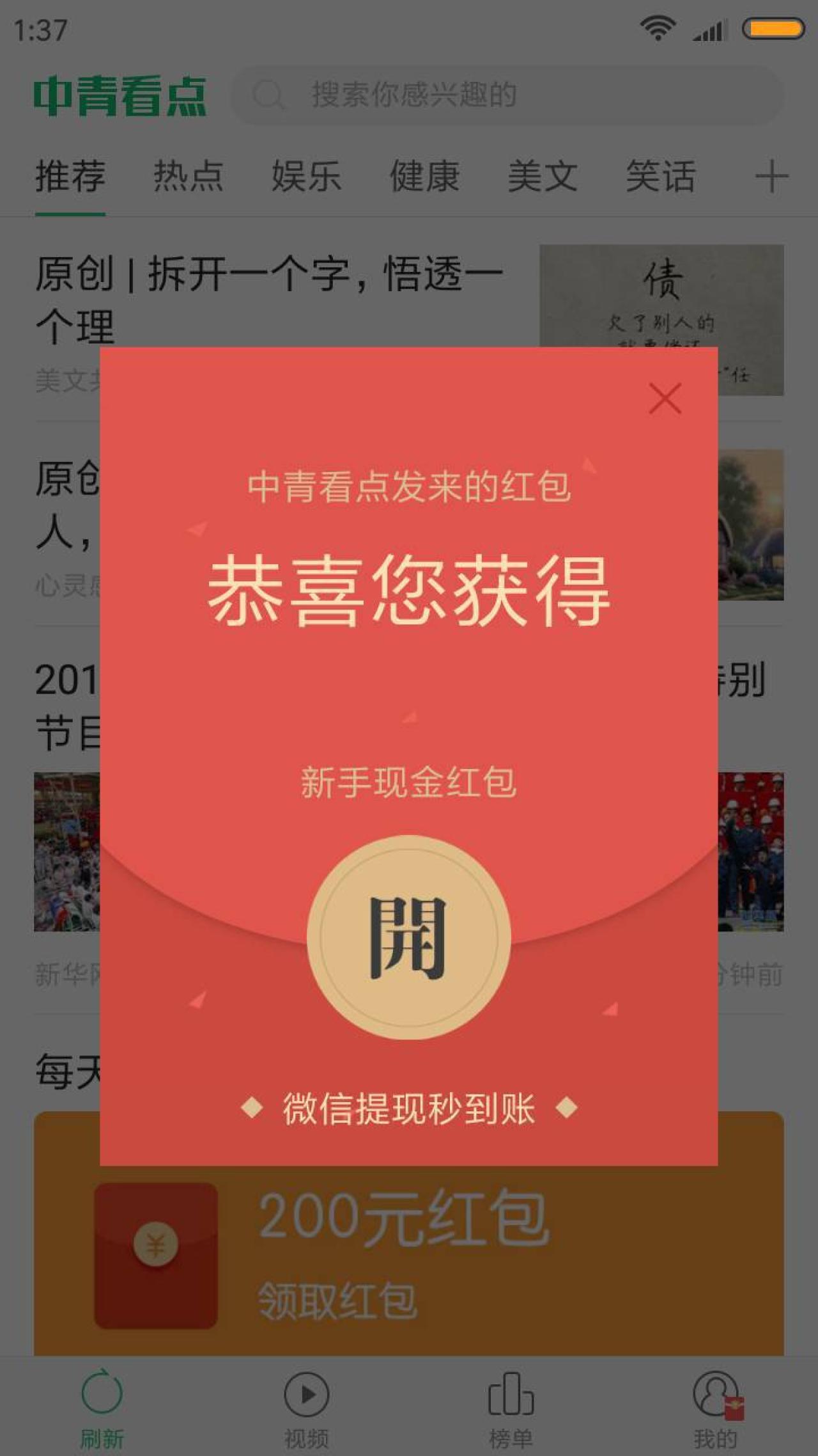 未安装过中青看点的朋友,点链接(安卓点第一,苹果点第二),下载中青看点,安装打开后,开红包,立即登录领取,微信登录,得0.9元,领取新手福利,签到得0.1元。返回,点我的,我的零钱,提现,微信提现,绑定手机号,输入真实姓名,手机号,再点微信授权,提现1元,直接到账微信零钱哦!