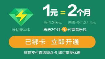 未开通微众银行的朋友,带二维码截屏,进入微信,点右上角+,扫一扫,从相册上传二维码,选截屏,进入活动页面,下拉,按照步骤说明,开通微众银行,并将微众银行卡添加到微信支付。返回活动页面,点已绑卡,立即开通,支付1元可得2个月绿钻豪华版(原价30元),再送2个月付费音乐包(原价16元)。