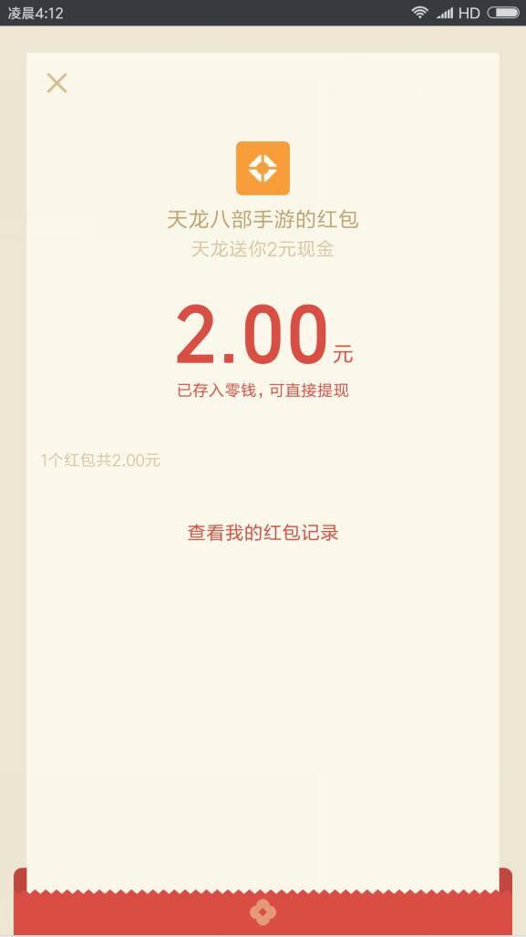 未注册过天龙八部的朋友截屏二维码,进入微信,点右上角+,扫一扫,点右上角,从相册上传二维码。点下载游戏,安装后打开,点 与微信好友玩,选区服时,不要选 互通 开头的区,选后面以 微信 开头的区,记住区服名称。创建角色。返回点 抢红包,选择区服和角色,小希领到了2元,可在微信零钱提现。
