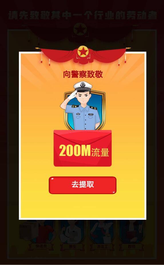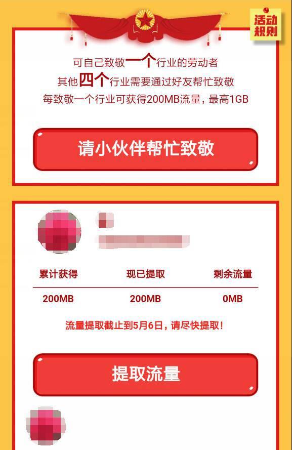 移动用户进入微信,点右上角+,添加朋友,公众号,搜索 中国移动和粉俱乐部,关注后,点 福利·活动,向劳动者致敬。点开始,选择对象致敬,可领取200M流量,邀请好友帮忙致敬,每邀请一位,可再领取200M流量。之后点提取流量,输入手机号将流量提取到手机,5个工作日内到账,流量到账当月有效。