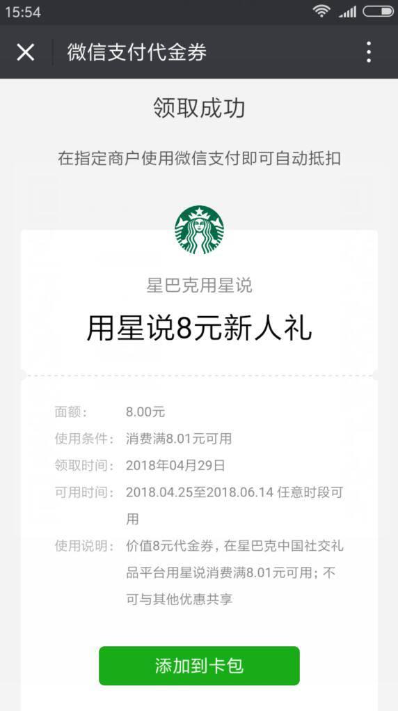 截屏二维码,进入微信,点右上角+,扫一扫,再点右上角,从相册选取二维码,上传截屏,可领取星巴克8元微信支付代金券,下拉,点添加到卡包,可在微信,我,卡包,我的票券中查看。在星巴克消费满8.01元,使用微信支付可使用。有效期至2018年6月14日。