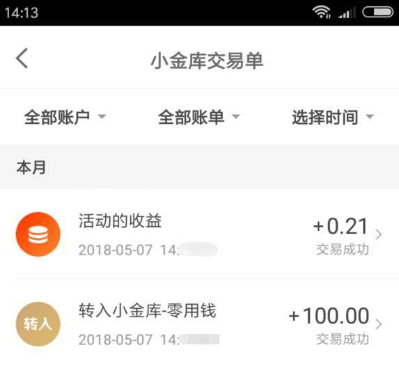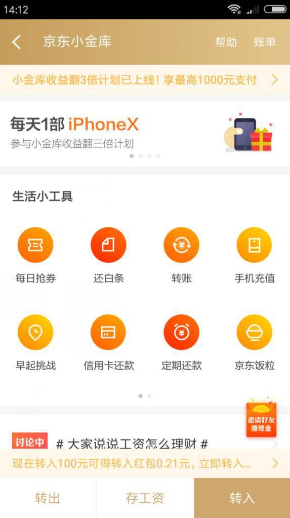 点链接,开始游戏,登录京东,点屏幕红包和金币,可抽现金红包和京东支付优惠券。每人3次机会。小希一次中了0.21元现金红包。得到红包后,点第二个链接下载并打开京东金融APP,进入京东小金库,向小金库-零用钱转入100元,红包到账,转入的钱和红包,都可提现。