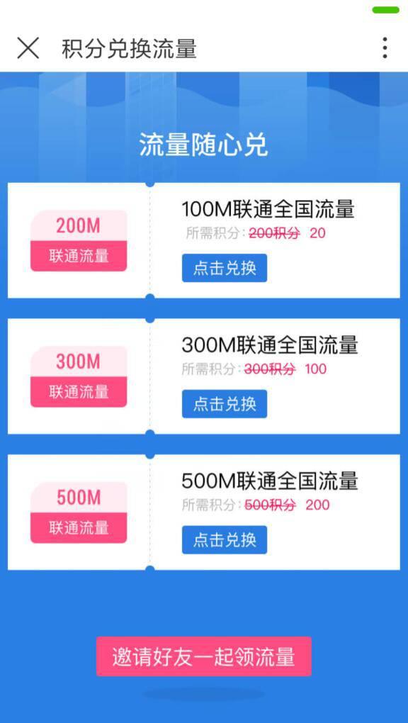 联通用户点链接,下载沃钱包APP,首次登录送200积分,在首页中部横幅中,找到积分兑联通流量。20积分=200M全国流量,100积分=300M,200积分=500M。小希换了200M,收到短信,三个工作日内到账。