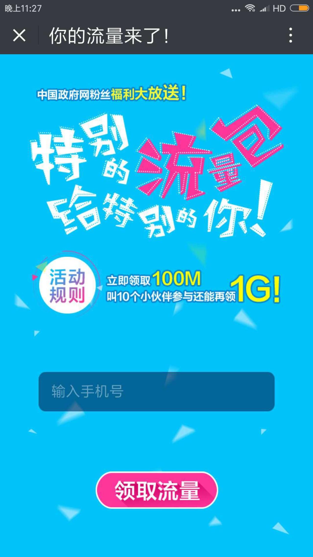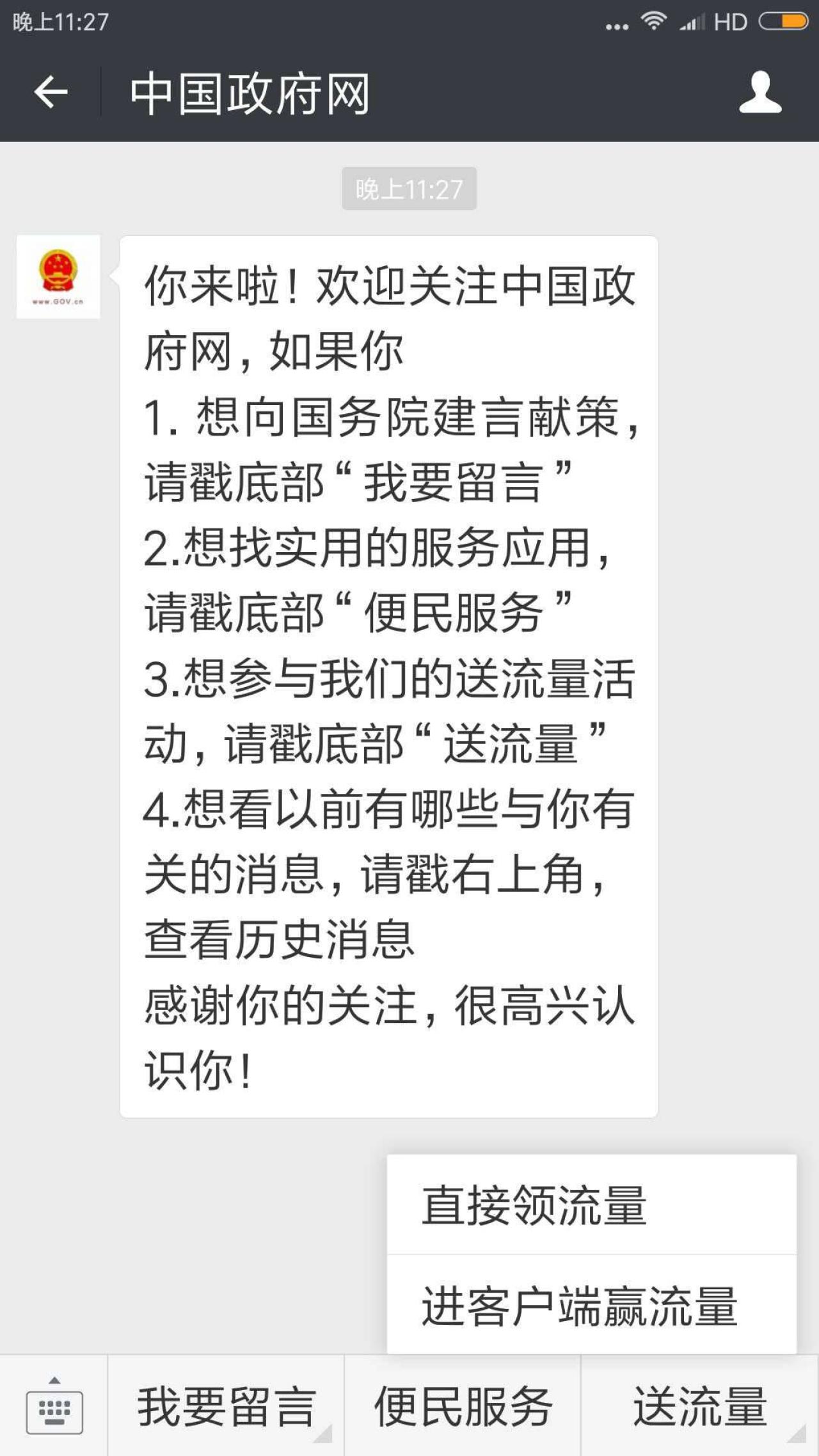 进入微信,点右上角+,添加朋友,公众号,搜索 中国政府网,关注后,点右下角 送流量,直接领流量,关闭Wifi,开启数据网络,点 领取流量,可领取100M流量。移动用户流量在7天内到账,电信和联通用户流量将在下月到账。点此再领300M流量。
