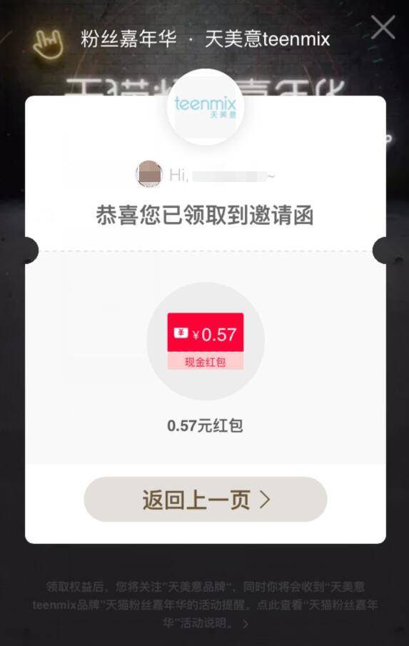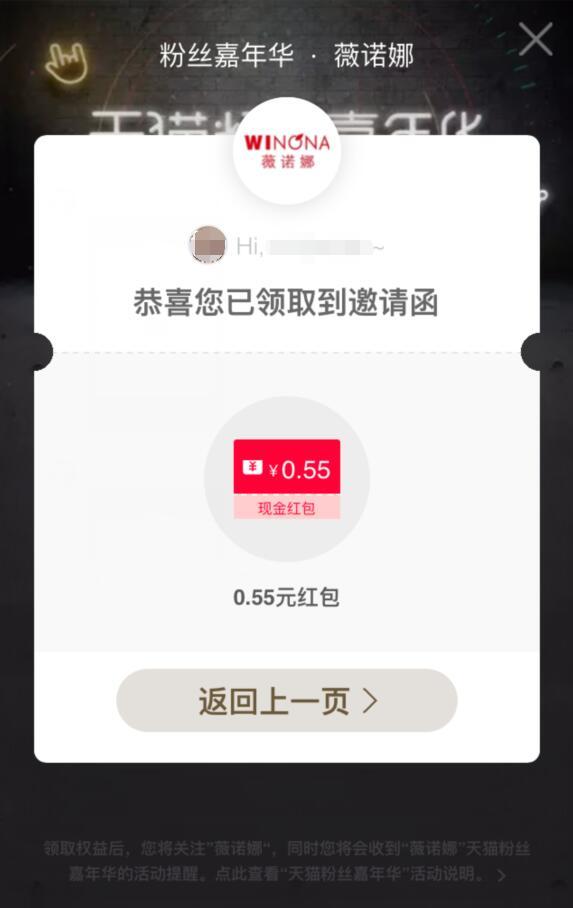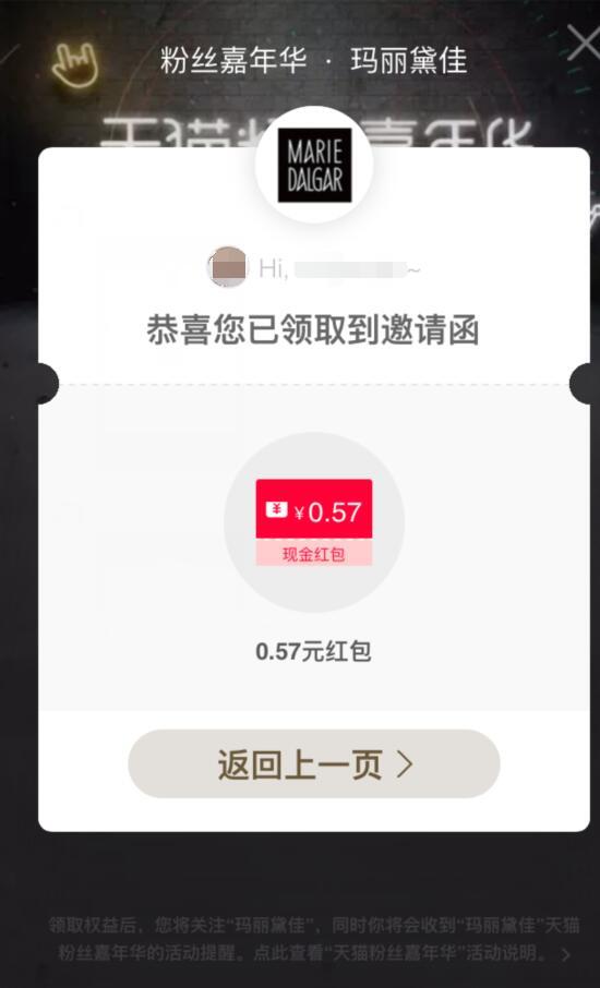 进入手机淘宝,搜索 粉丝嘉年华,点每个店铺名称下面的 领 按钮,稍等片刻,或弹出 邀请函(个别店铺不弹出,可跳过),然后点 领,有机会获得 优惠券 和 现金红包。小希开始都是没有奖或者优惠券,然后连续领了3个现金红包。红包可在6月20日前,在天猫购买实物商品,叠加使用(单次不超过10个)。