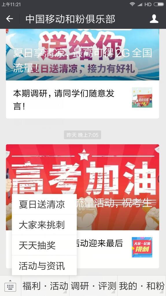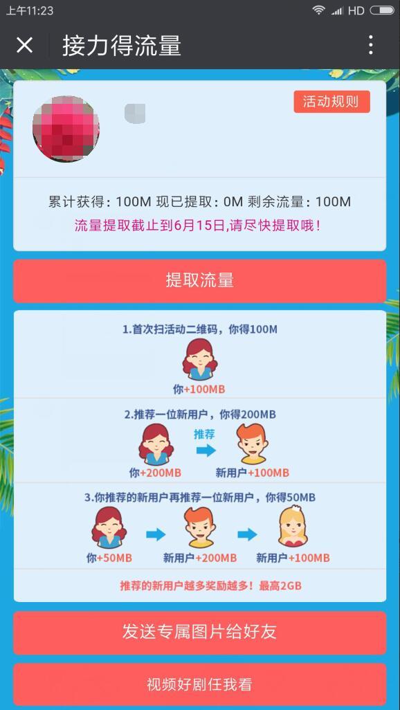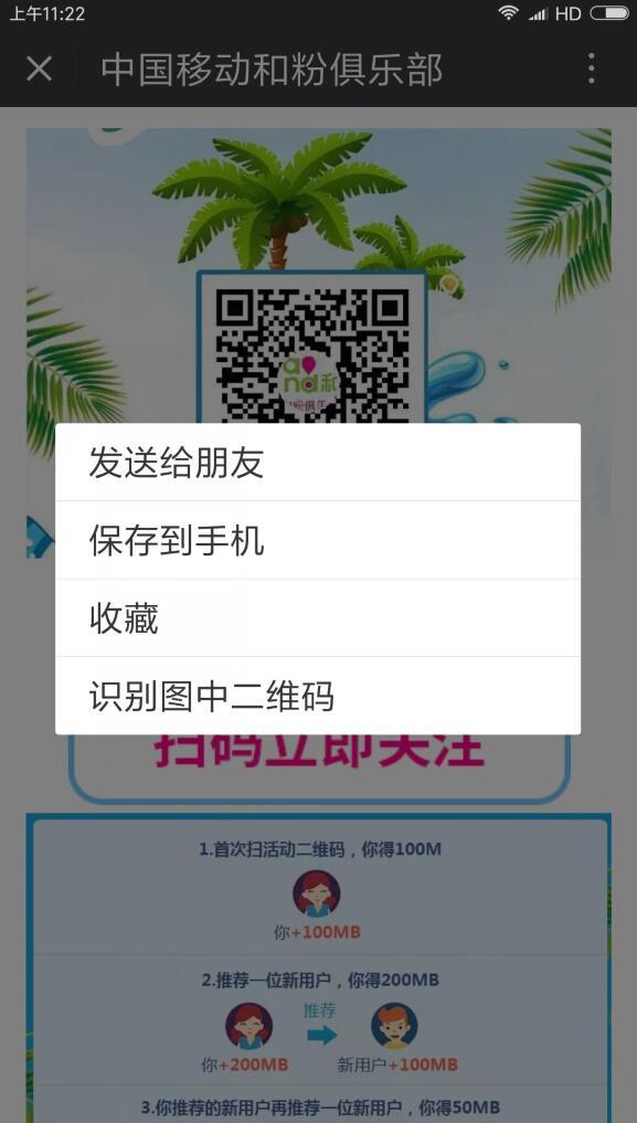 移动用户进入微信,点右上角+,添加朋友,公众号,搜索 中国移动和粉俱乐部,关注后,点底部福利,夏日送清凉,下拉找到二维码,长按,识别图中二维码,点收到消息中的提取流量,提取流量,输入手机号和验证码,可提取100MB流量。请在活动期间提取,过期无法提取哦!
