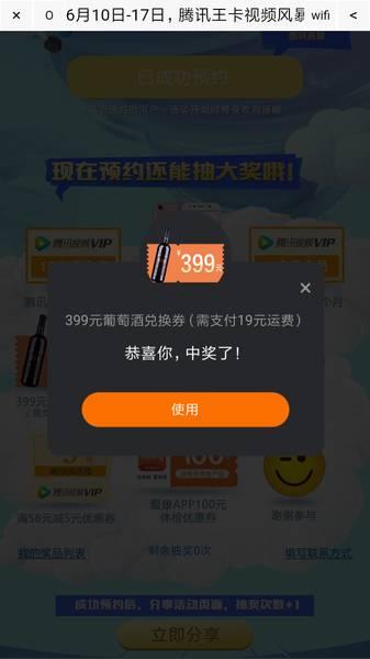 点链接,预约,登录QQ,下拉,可抽奖一次。再下拉,点立即分享,可抽奖一次。奖品可能是葡萄酒兑换券,爱康体验优惠券,腾讯视频VIP 1个月或12个月,腾讯视频满58减5优惠券,2Q币等。大家可以试试运气哦!