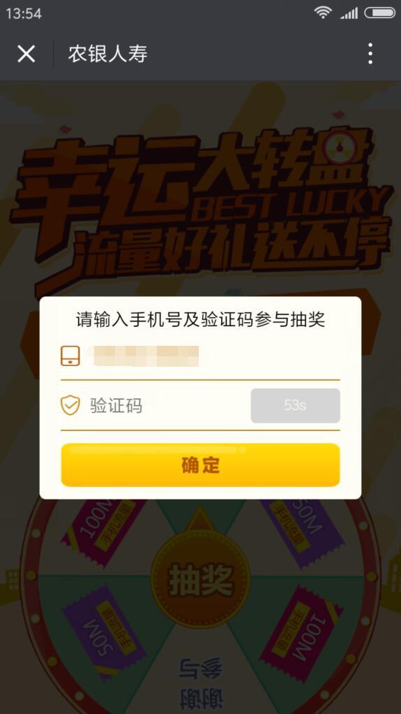 进入微信,点右上角+,添加朋友,公众号,搜索 农银人寿,关注后,每天前2000名关注,必中流量,建议大家明天凌晨再继续下面的操作。点在线商城,关注有礼,输入手机号和验证码,确定,点抽奖,小希抽到了50M手机流量,当月有效,到账很快,有短信提示。