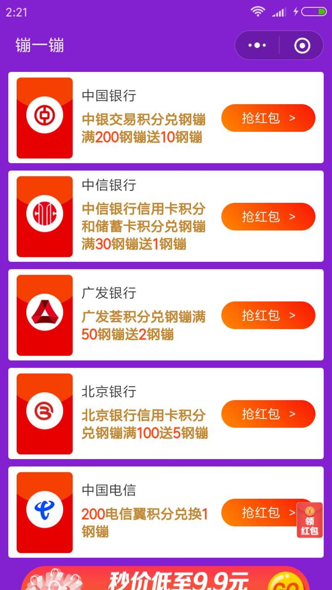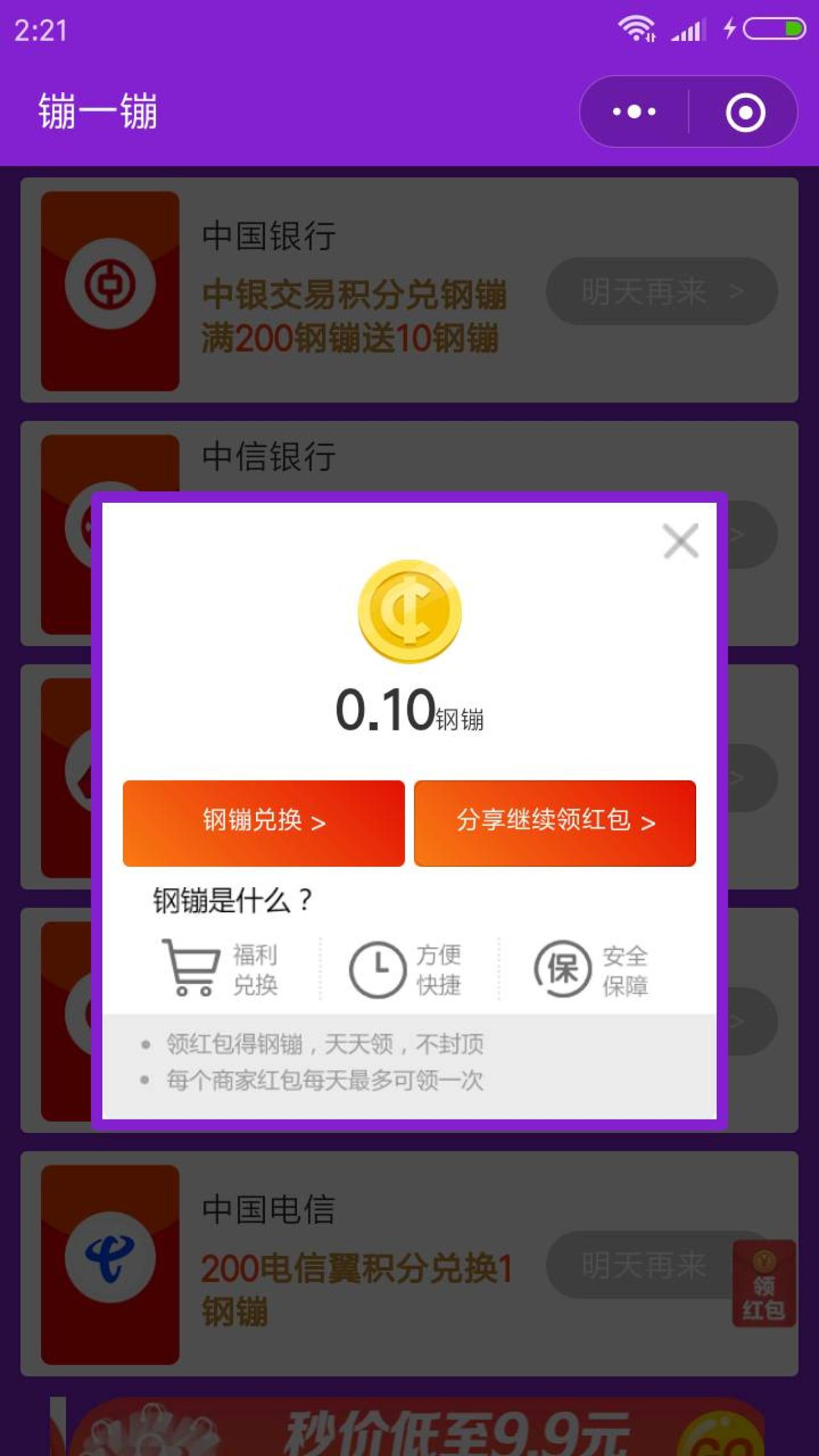 进入微信,搜索 镚一镚,进入镚一镚小程序,用微信授权登录,下拉分别点击5个抢红包按钮,每点一个,可得0.1钢镚,总共可得0.5钢镚。在京东购物,下单后支付,可使用钢镚付款,1钢镚可抵扣现金1元。