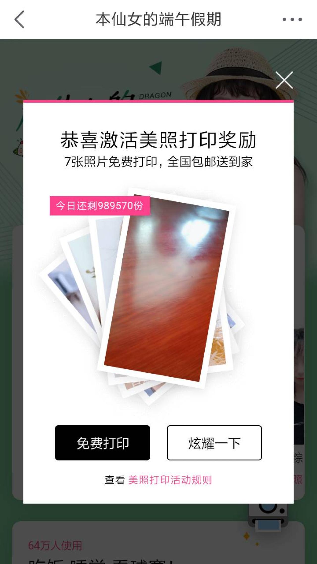 点链接下载美颜相机,安装后打开,点右下角的粽子标识,如果没有,退出再打开一次。进入《本仙女的端午假期》活动,点去拍照,拍摄任意一张照片,保存后,可激活 7长照片免费打印,全国包邮送到家 活动,点免费打印,注册或登陆美颜相机,挑选照片,上传填写收货地址即可。