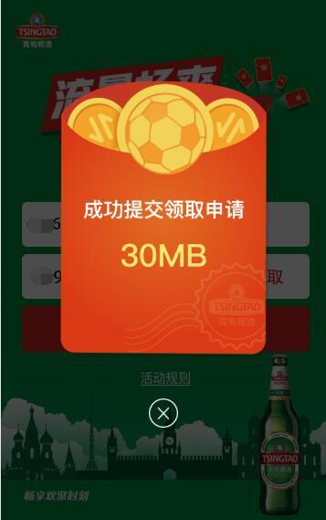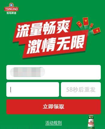 联通用户点链接,参加”青岛啤酒陕西销售“活动,输入手机号,点 立即领取,输入验证码,再点 立即领取,成功提交领取申请,可收到30MB全国流量,当月有效,以到账短信为准。每个用户每月最多可以领10次。