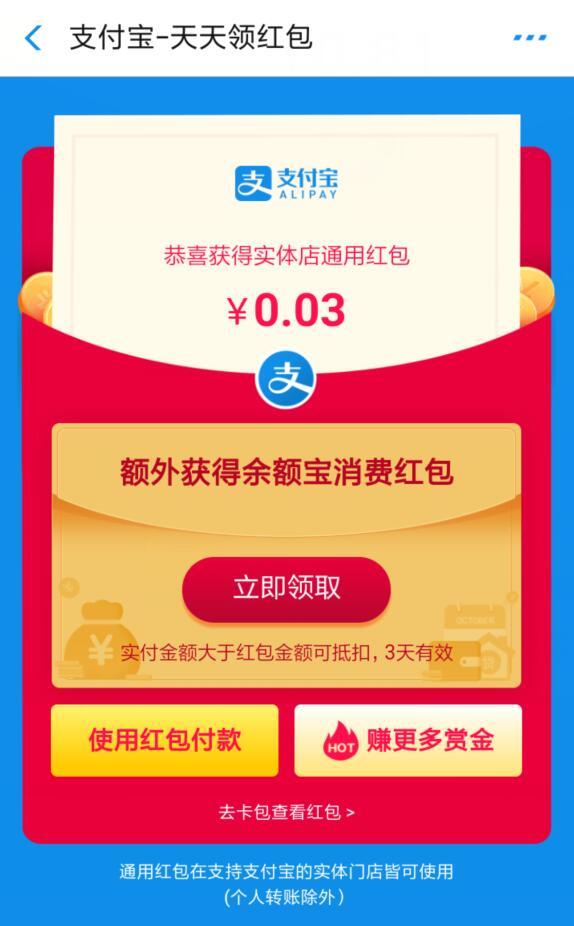进入支付宝,每天搜索 7302073,点搜索“7302073”,天天领红包。可得一个实体店通用红包,进入实体店铺消费,可抵用现金。然后点”额外获得余额宝消费红包“的立即领取,可领取大额余额宝消费红包,小希领到了5元。先在余额宝中存入一定现金,使用支付宝付款,选余额宝支付可用。每天都可领取哦!