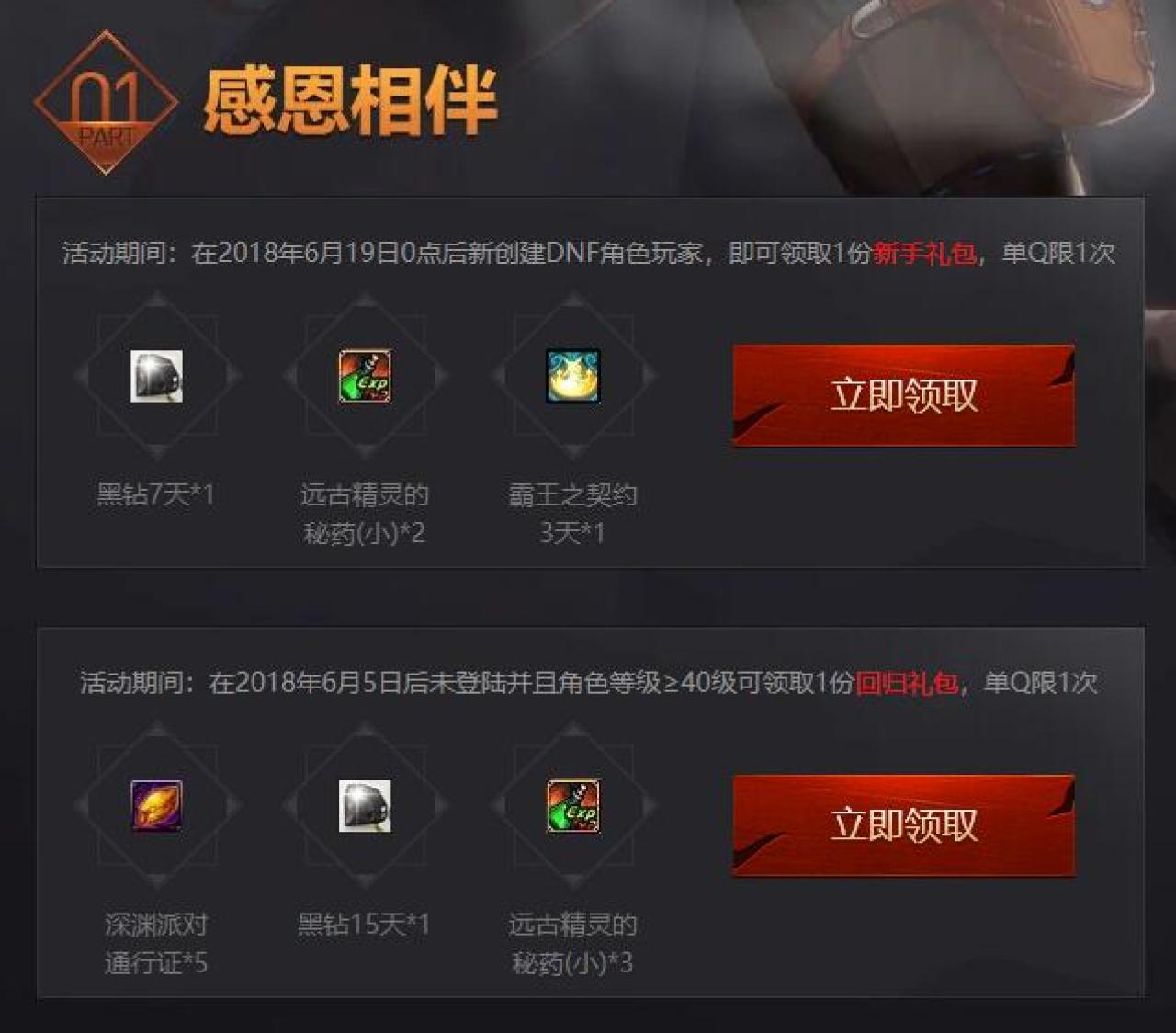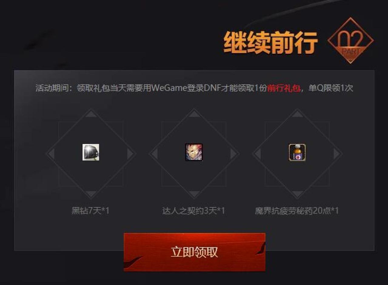 DNF玩家用电脑点链接,在2018年6月19日0点后新创建DNF角色玩家,即可领取1份新手礼包(含QQ黑钻7天),在2018年6月5日后未登陆并且角色等级≥40级可领取1份回归礼包(含QQ黑钻15天)。下载WeGame,登录DNF,可领取前行礼包(含QQ黑钻7天)。