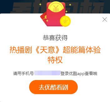 点链接,参加番茄财富与优酷举办的《上优酷看世界杯》活动,下拉,输入手机号,点立即领取,可领取优酷体验特权3天,享受指定剧集免广告,1080P画质特权。小希获得是热播剧《天意》超能篇体验特权。