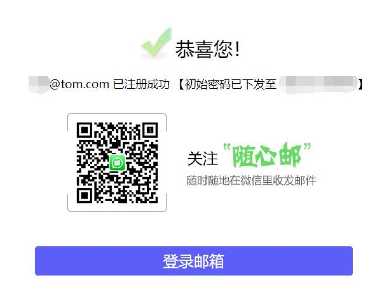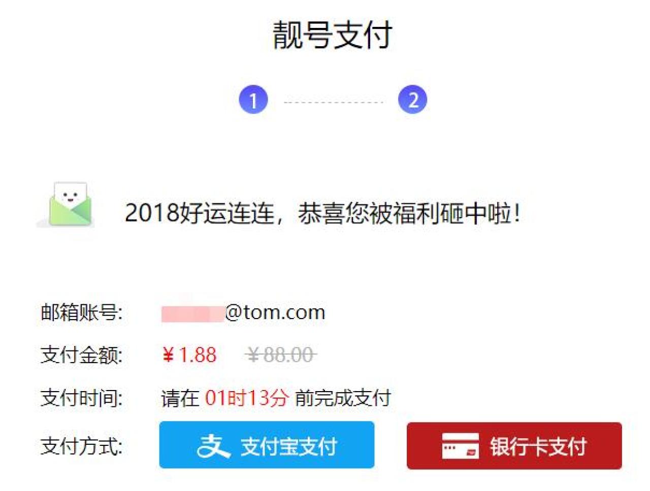 用电脑点链接,可注册 @tom.com TOM邮箱靓号,3-5位。需填写邮箱账号,手机号码,一个号码只能注册一个靓号,点下一步,支付1.88元一次性买断靓号,付款成功后,邮箱密码会发送到你的手机。用默认密码,登录邮箱,然后修改密码就可以使用了。TOM是曾经的4大门户。实测发送邮件会带小广告,无法关闭哦!
