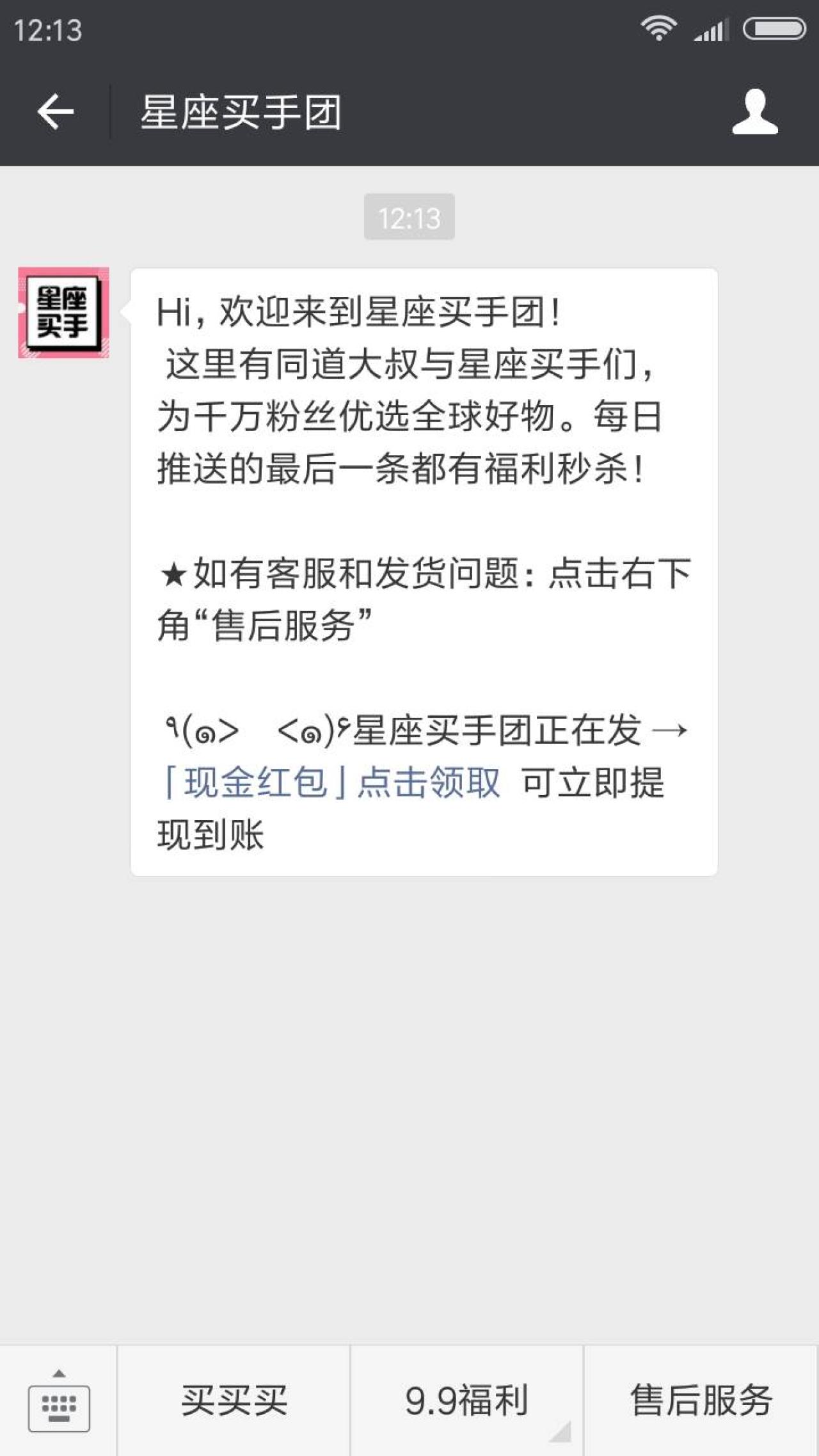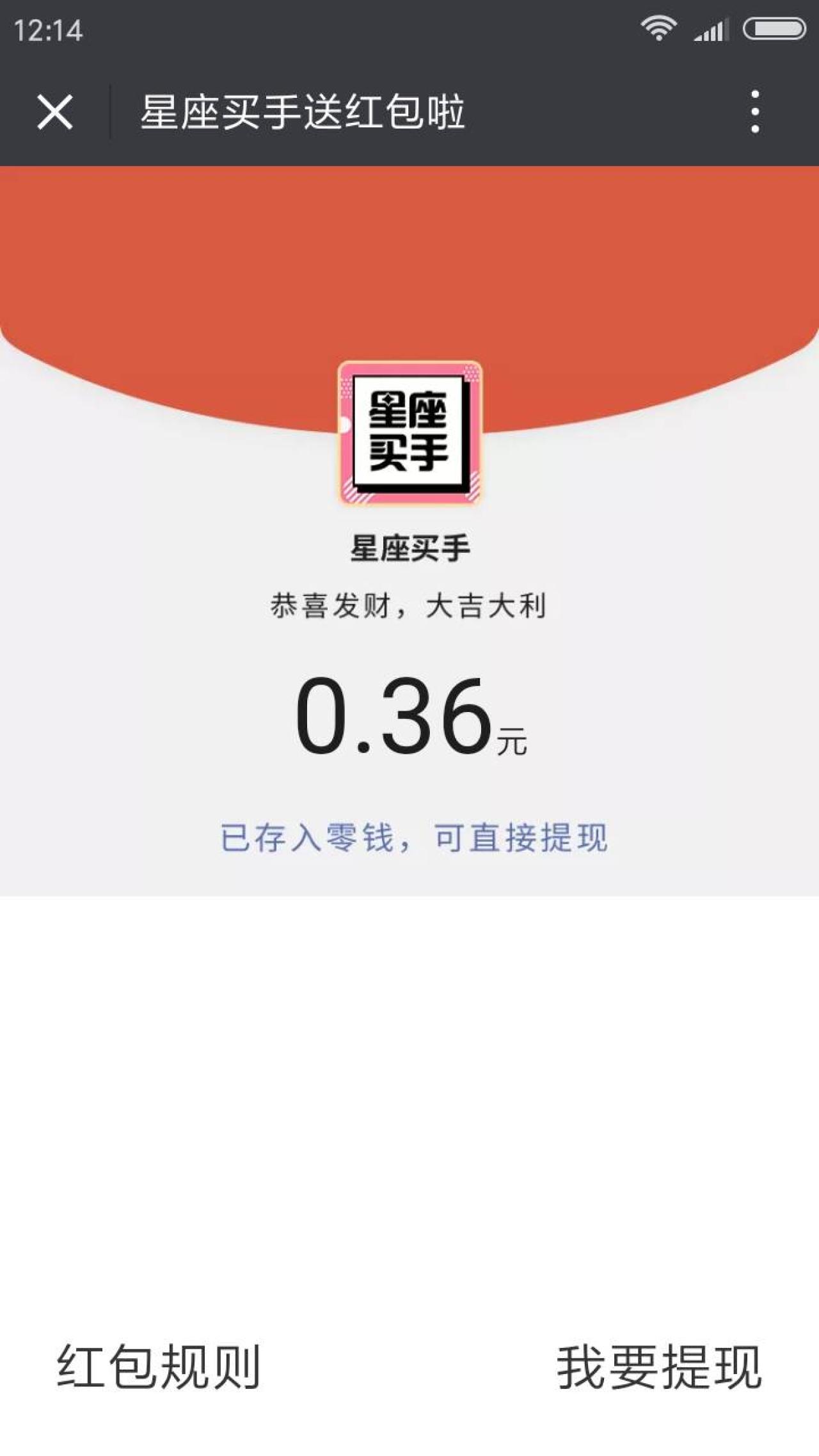 进入微信,点右上角+,添加朋友,公众号,搜索 星座买手团,点推送消息中的“现金红包 点击领取”,拆红包,可领取随机金额的现金红包,点右下角我要提现,输入支付宝帐户名和姓名,到账支付宝余额,可提现。
