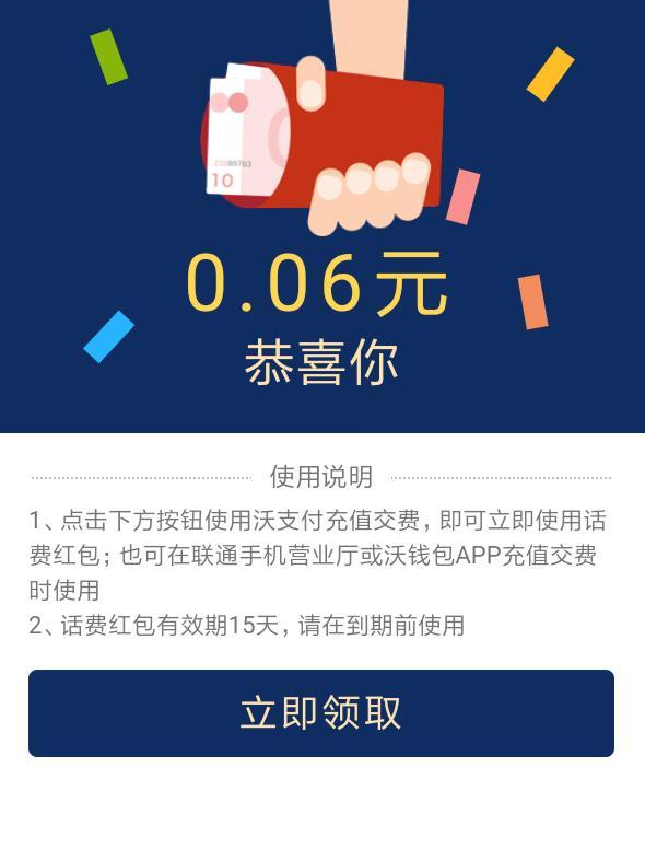 联通用户点链接,下载联通手机营业厅,在中部横幅中,找到《你看世界杯 沃来送话费》,输入手机号和验证码,可领取随机金额的话费券。小希领到了0.06元。然后返回,进入交费充值,其它金额,输入你获得话费券的金额,用话费券抵扣,就可以0元充值,将话费券里的金额充值到自己的手机话费。