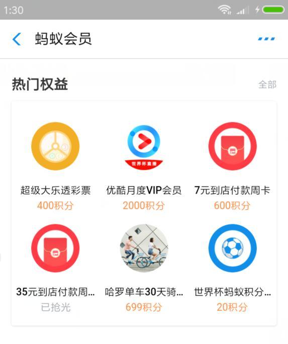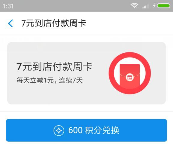 进入支付宝APP,点我的,蚂蚁会员,下拉到热门权益,点 7元到店付款周卡,可用600积分兑换周卡。每张周卡包含7个1元红包,红包仅限在支持支付宝付款的商家实体门店使用,在商家实体门店付款时自动优惠。在活动期间每个用户每7天仅限兑换一次,兑换成功后,积分无法退回。每人每天限使用一个红包。