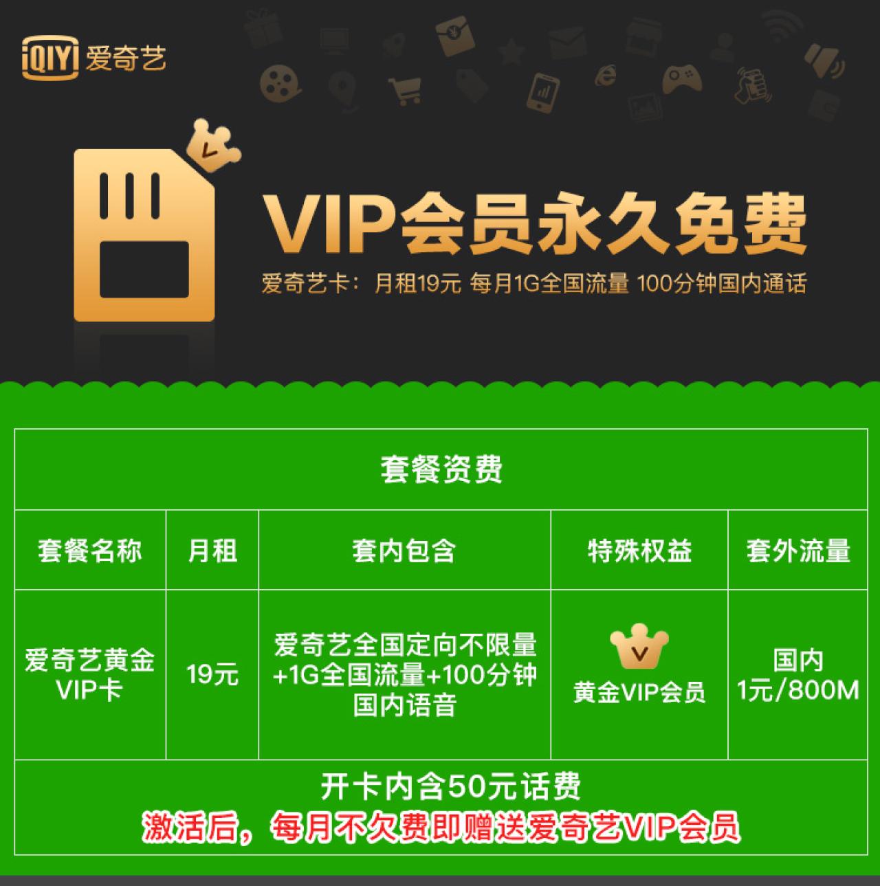 点链接,可以办理辽宁电信“爱奇艺黄金VIP卡”,月租19元,套餐内含爱奇艺+百度系(贴吧、快手)+网易系(荒野行动、网易云音乐)免流量+1GB全国流量+100分钟国内语音,只要不欠费,一直赠送黄金VIP会员。套餐外流量1元800M。