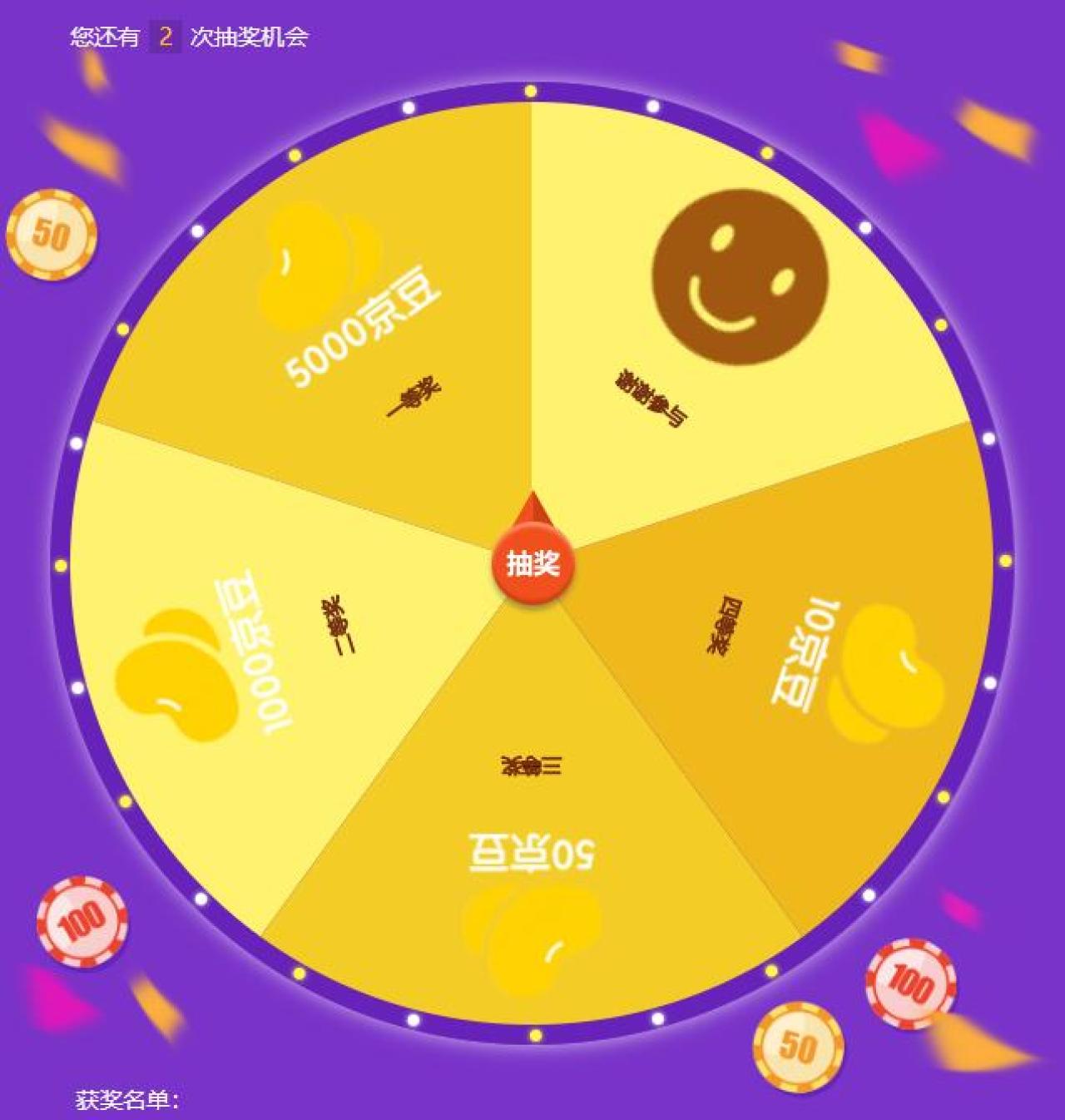 点链接,参加《格力狂欢再续24小时》活动,下拉找到转盘,每人有2次抽奖机会,点抽奖参与,每人最多中奖1次。小希中了四等奖,奖励10京豆。在京东下单购物时,每满1000京豆可抵扣10元。