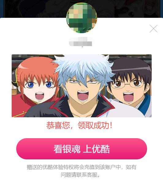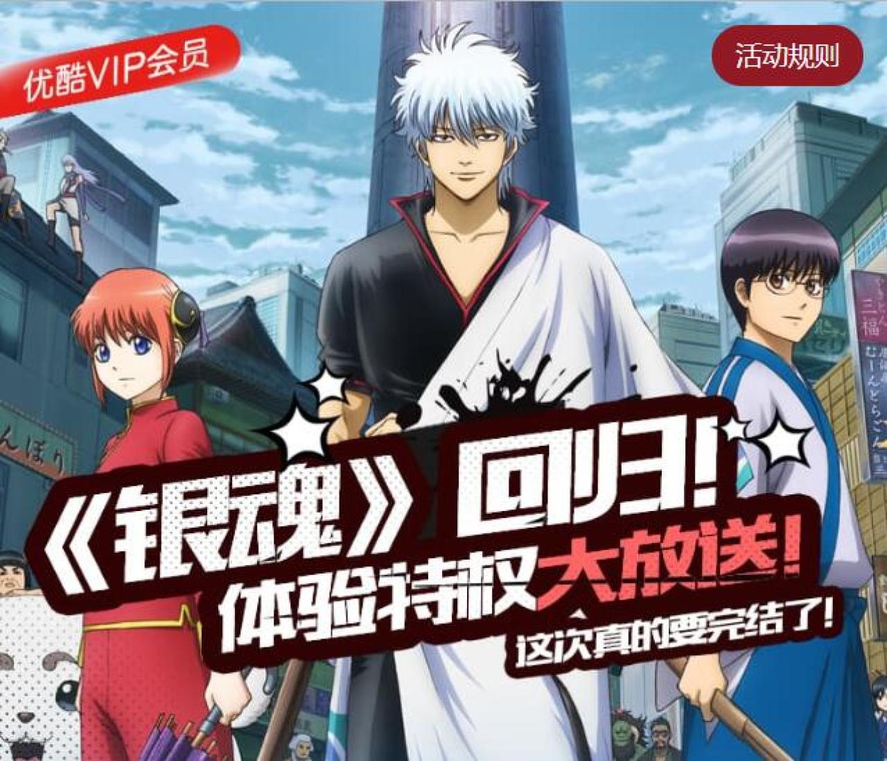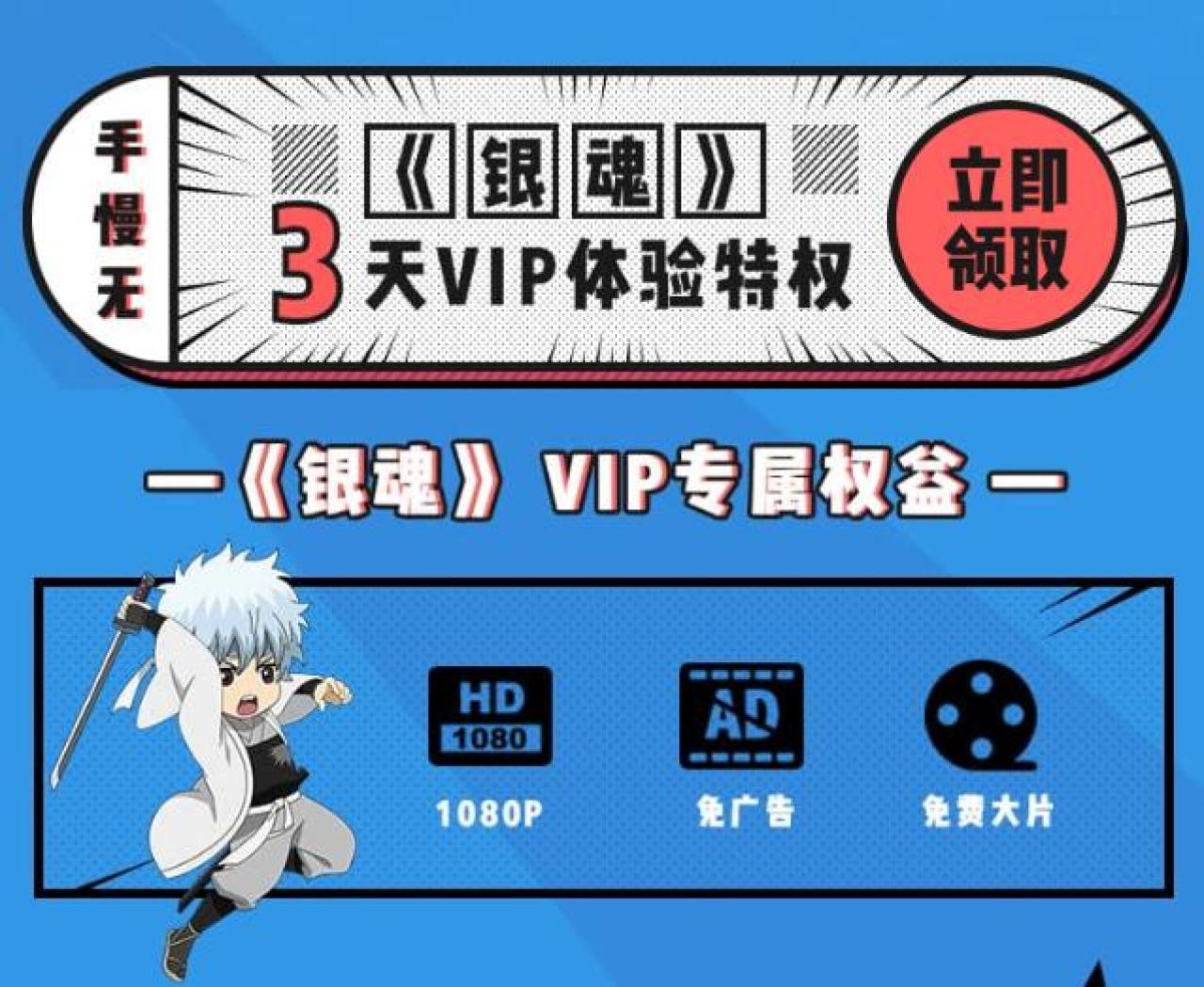 点链接,点立即领取,登录优酷,可领取“《银魂》3天VIP体验特权”,3天免费观看《银魂》,免广告,享受1080P画质。不可观看其他付费视频,本权益适用于pc/手机/ipad端,不可用于tv端。