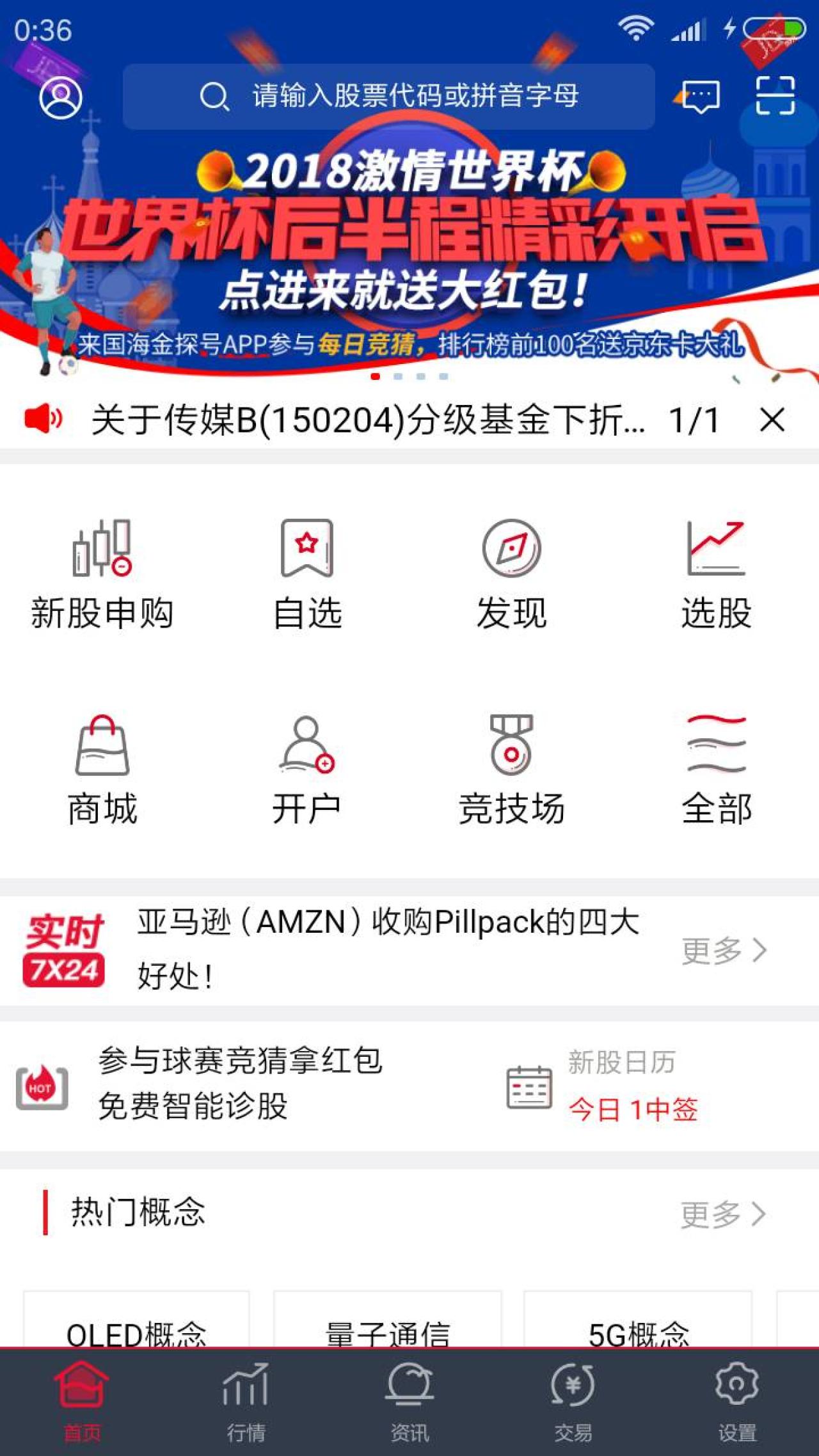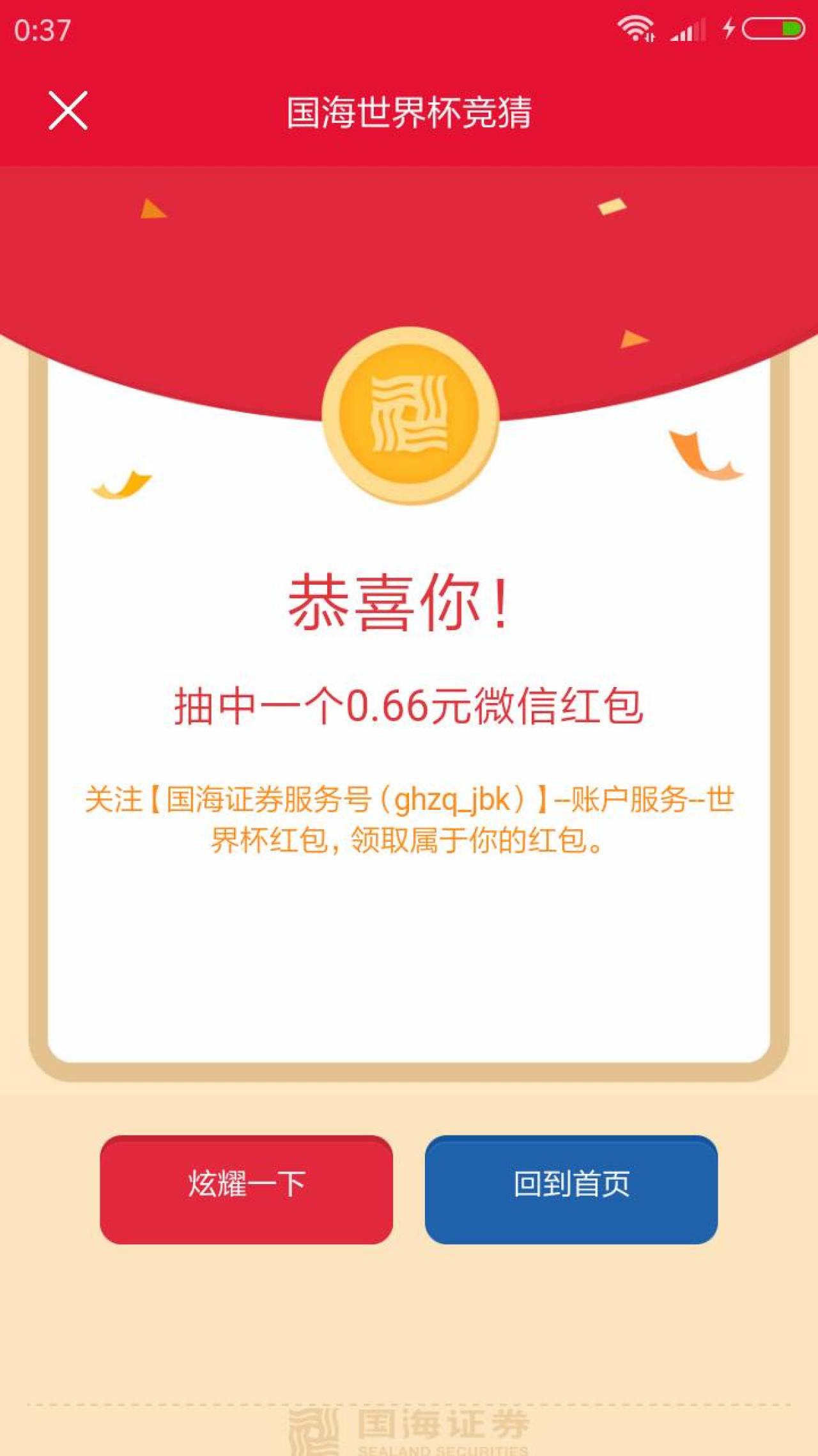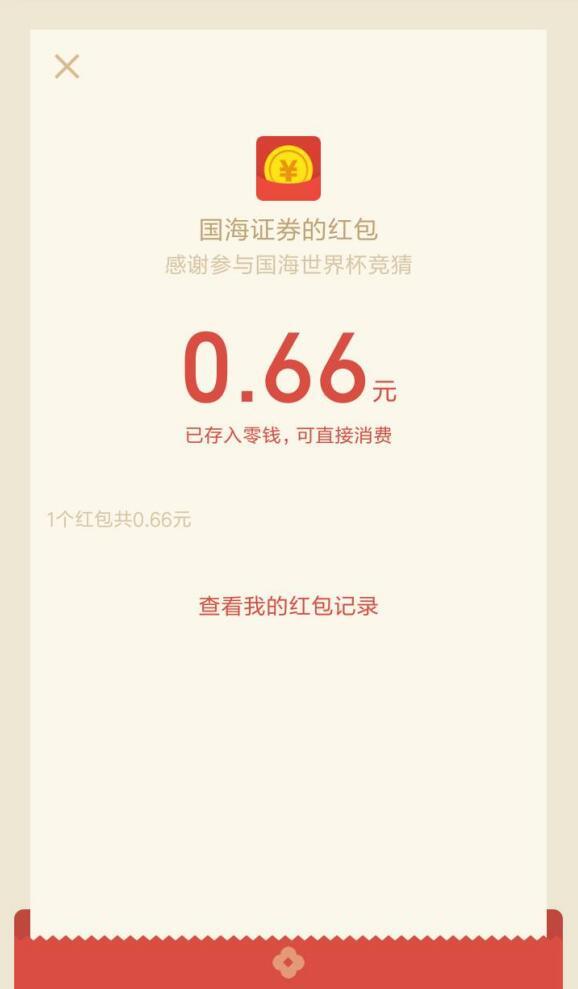 进入微信,点右上角+,添加朋友,公众号,搜索 国海证券服务号,点 行情交易,手机APP下载,点 国海金探号 下载安装后,点《2018激情世界杯》,输入手机号,点弹出红包,抽取随机金额红包。返回微信 国海证券服务号 公众号,点 账户服务,世界杯红包,领取后等候服务通知,拆红包,到账微信零用钱。