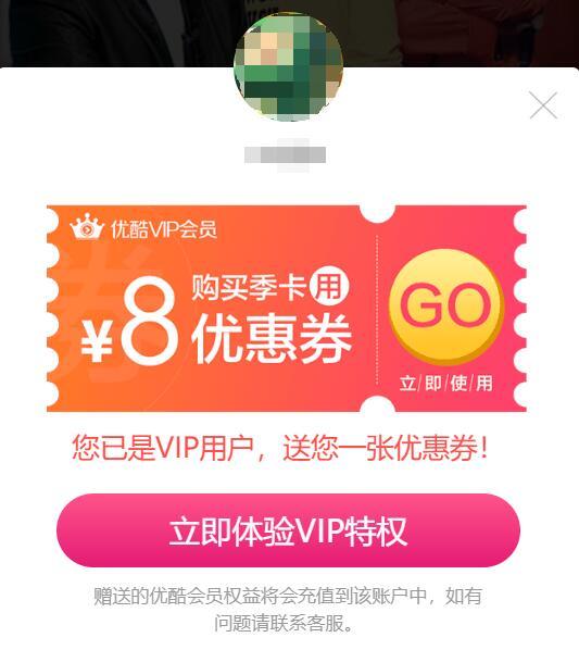 点链接,下拉到中部,点领取,登录优酷,可领取《周六夜现场》3天VIP体验特权,观看《周六夜现场》XXXL版,比免费版增加了笑料和看点。享受《周六夜现场》无广告和1080P画质。小希之前免费领了1个月的优酷会员,所以得到的8元优惠券,购买优酷季卡可用。