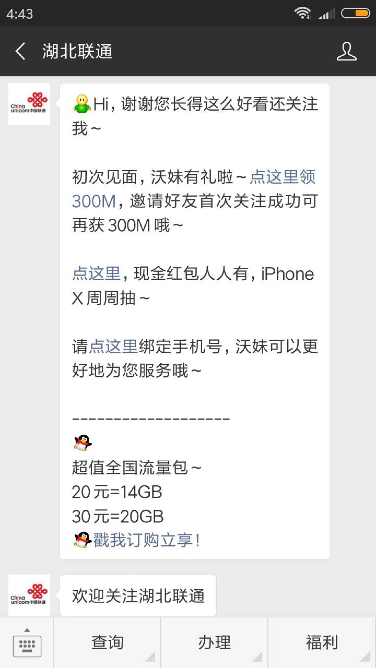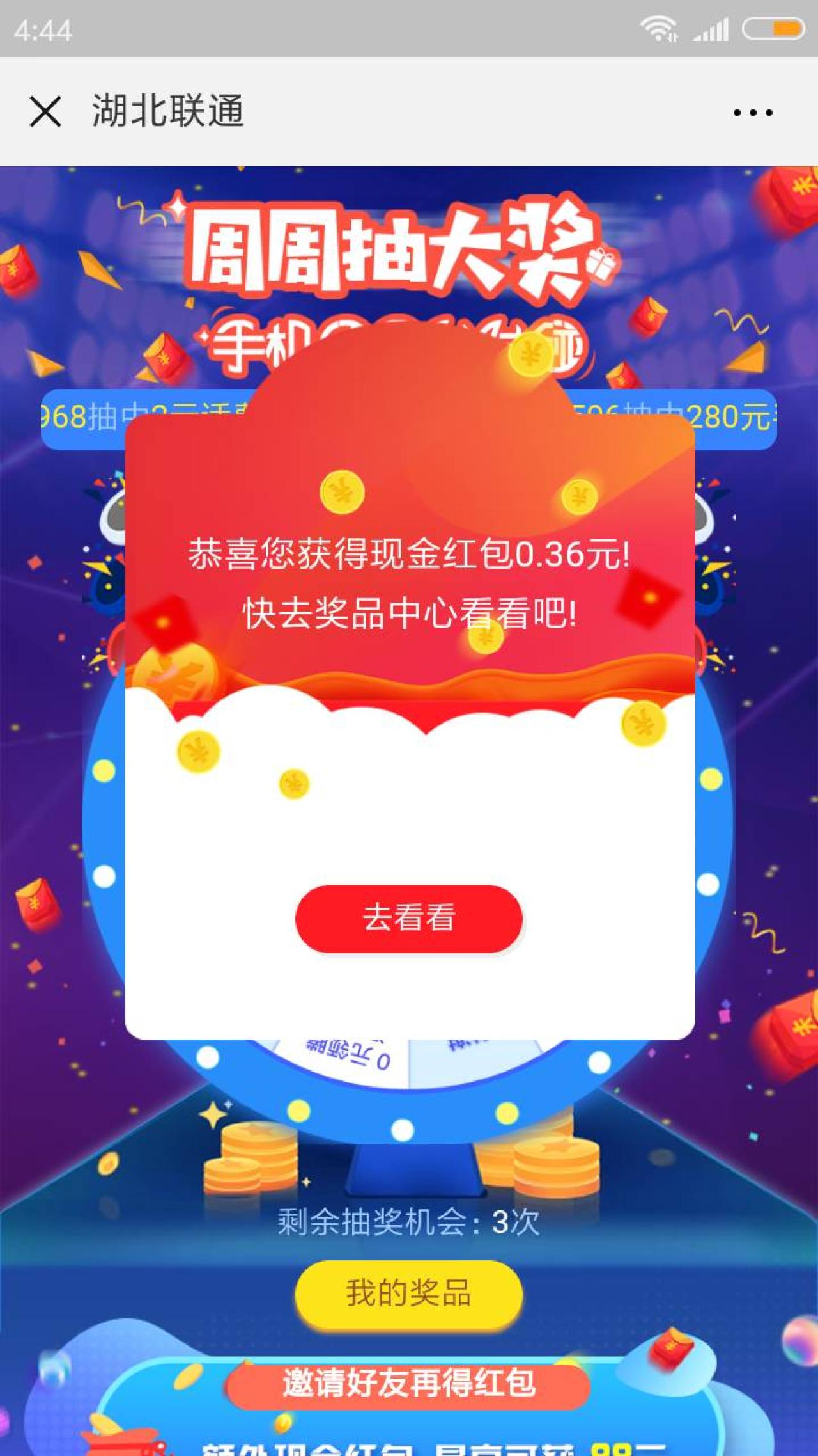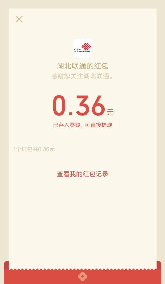 进入微信,点右上角+,添加朋友,公众号,搜索 湖北联通,关注后,找到《点这里,现金红包人人有,iPhoneX周周抽》,点进去,点抽奖,会提示绑定手机,依次输入手机号和验证码,绑定成功后自动返回公众号,再次“点这里”,进入后,会得到随机金额的现金红包。小希得了0.36元。