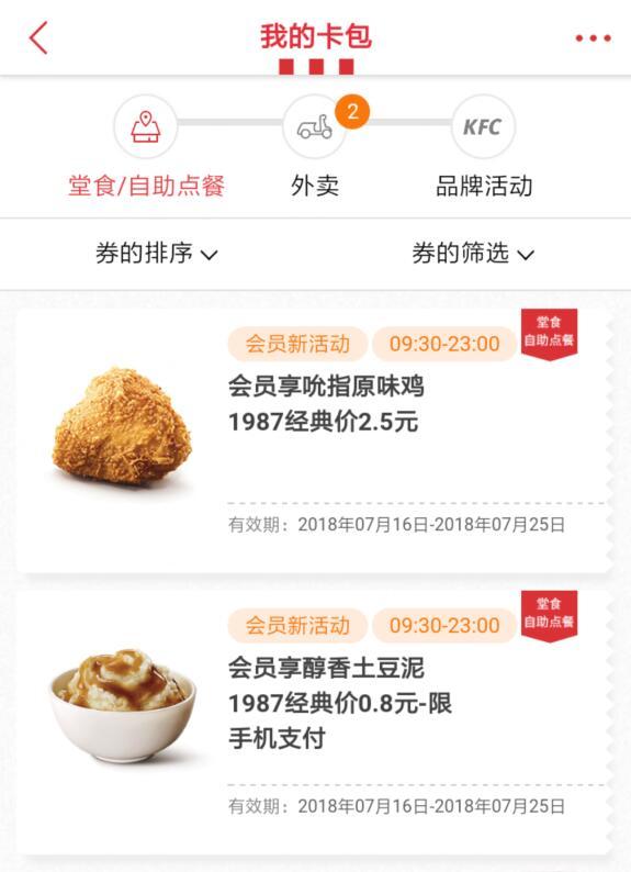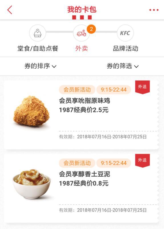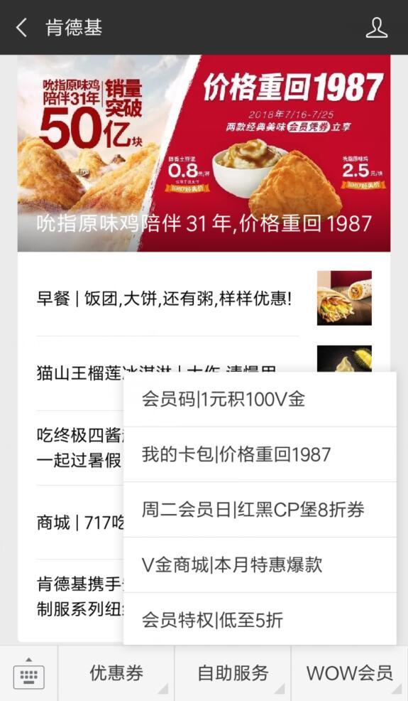 进入微信,点右上角+,添加朋友,公众号,搜索 肯德基,关注后,点WOW会员,点我的卡包|价格重回1987,可领取肯德基堂食/自助点餐优惠券2张以及外卖券2张,可以2.5元自助或外卖点餐吮指原味鸡,0.8元自助或外卖点餐醇香土豆泥。