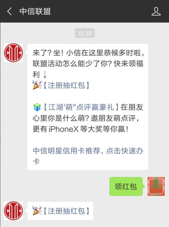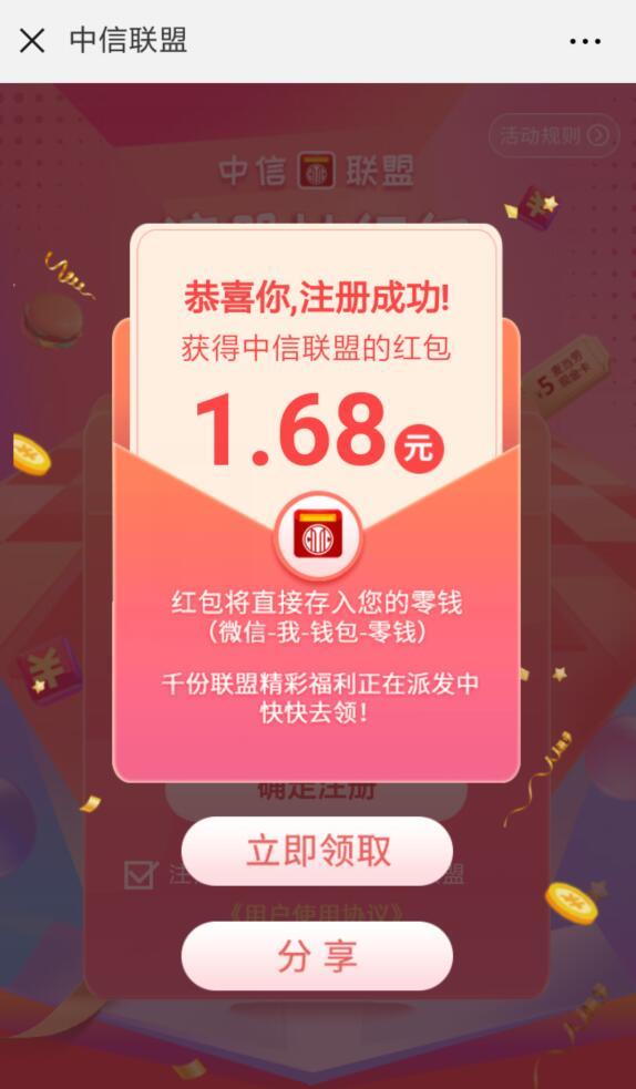 进入微信,点右上角+,添加朋友,公众号,搜索 中信联盟,关注后,回复 领红包,点 注册抽红包,输入手机号和验证码,确定注册后,有一定几率获得现金红包,最高88元,现金红包共49万份,非必中。小希中了1.68元,点立即领取,到账微信零用钱,可提现。