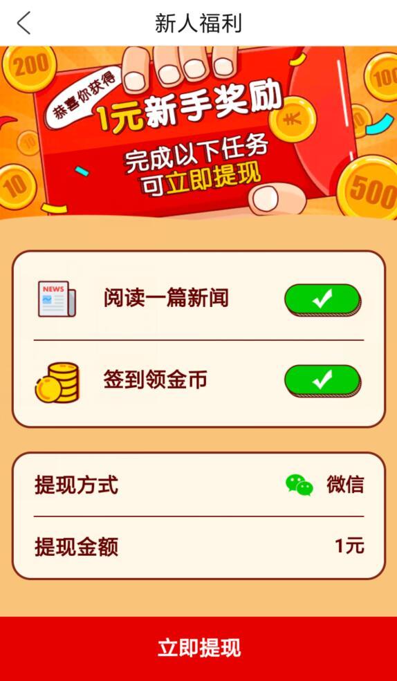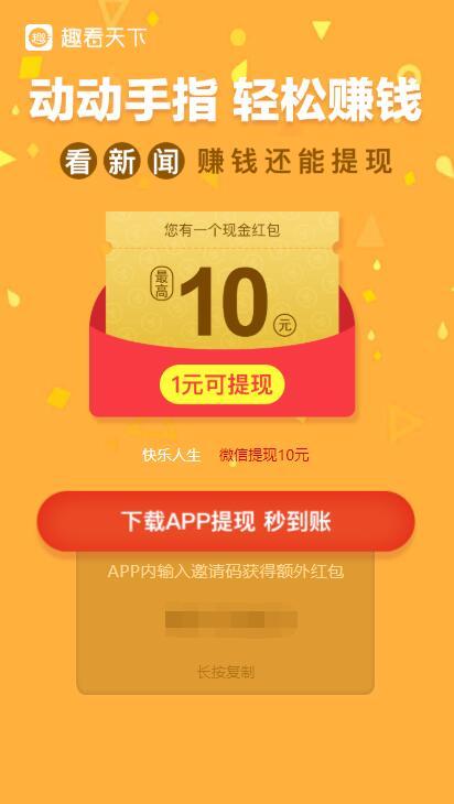 点链接,点“下载APP提现 秒到账”按钮,下载安装《趣看天下》客户端后,进入,点出现的红包,用微信登录,按APP引导操作,完成阅读一篇新闻,签到领金币任务后,点立即提现,输入微信绑定银行卡的真实姓名,授权微信,提现后,到账微信零用钱,可提现!感谢 不可笑哦 提供线报。