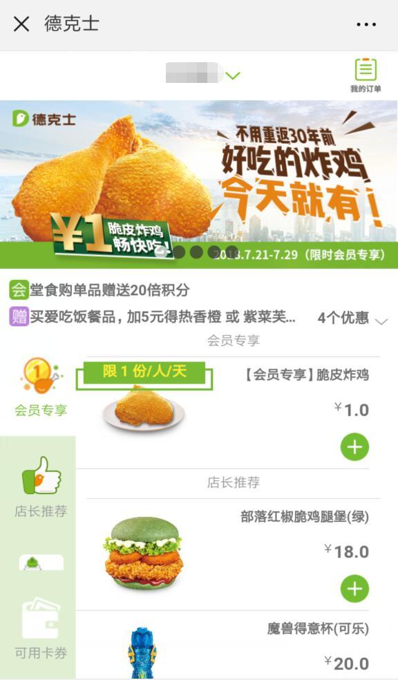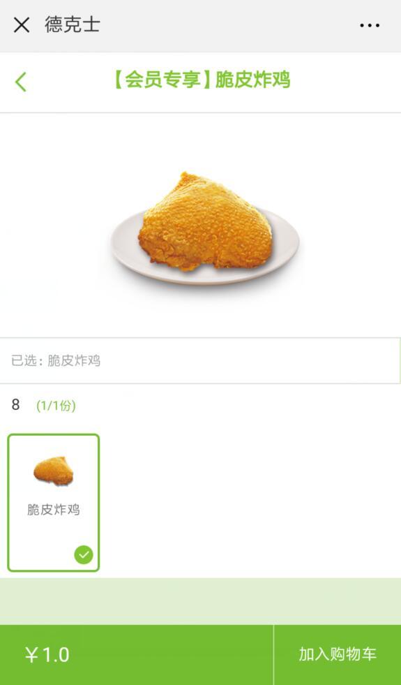 进入微信,点右上角+,添加朋友,公众号,搜索 德克士Dicos,关注后,点我的会员,注册或登录德克士会员,返回点自主点餐,选择附近位置的德克士餐厅,进入菜单,参加《不用重返30年前,好吃的炸鸡今天就有!》活动,可购买【会员专享】脆皮炸鸡,每人每天可以购买1份1元脆皮炸鸡。