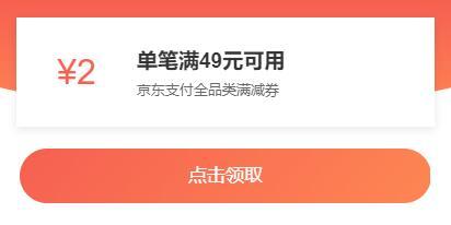 点链接,登录京东,点击领取,可领取京东支付全品类满减券,满49元减2元,可以在京东全平台使用。本优惠券由京东金融提供。