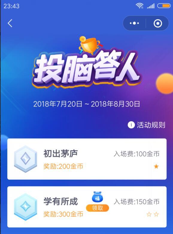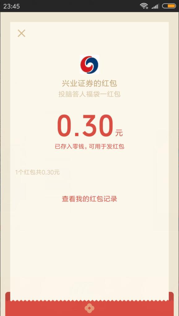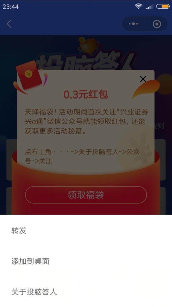 进入微信,点右上角+,添加朋友,公众号,输入 兴业证券,搜索关注后,点 活动,投脑达人,排位赛,点 初出茅庐,回答5道问题,只要获胜一次。返回,点 学有所成 右侧的蓝色福袋。点右上角的···,关于投脑达人,相关公众号,关注 兴业证券兴e通,返回刚才的位置,领取福袋,可领取0.3元现金红包。