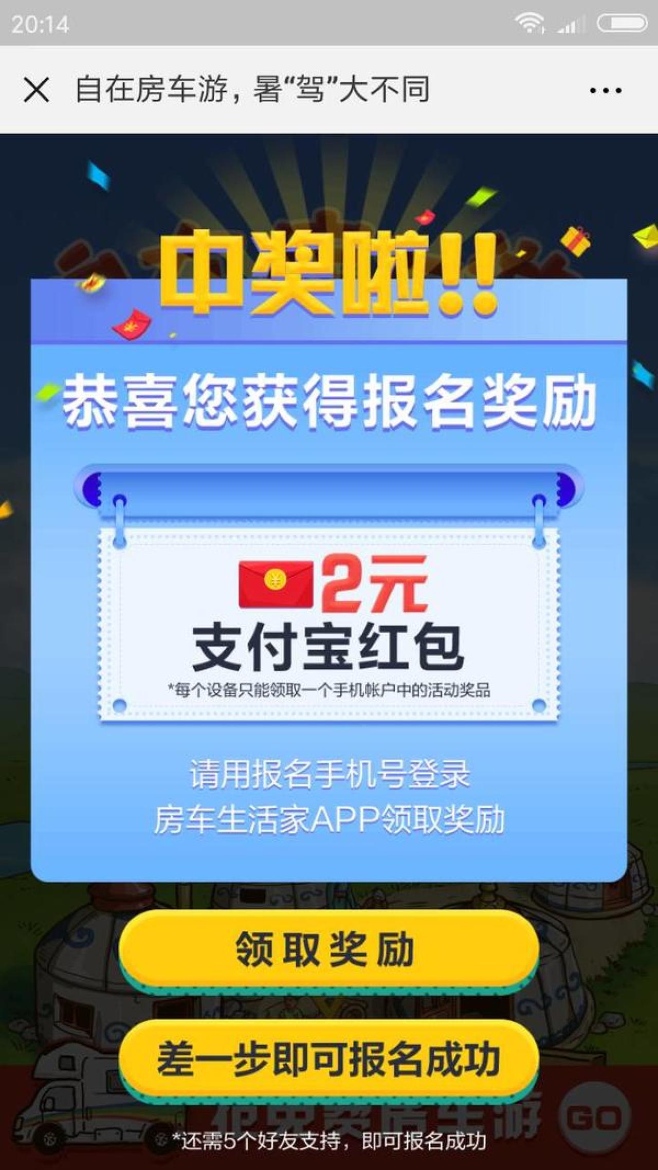 进入微信,点右上角+,添加朋友,公众号,搜索 房车生活家,关注后,回复 暑假报名,进入活动,填报名信息,姓名,手机号和驾龄,领报名奖励。点领取奖励,下载安装房车生活家APP,安装后,用登记的手机号登录,进入APP内的活动页面,点我的奖品,填支付宝姓名和账户名,领取红包,48小时内到账。