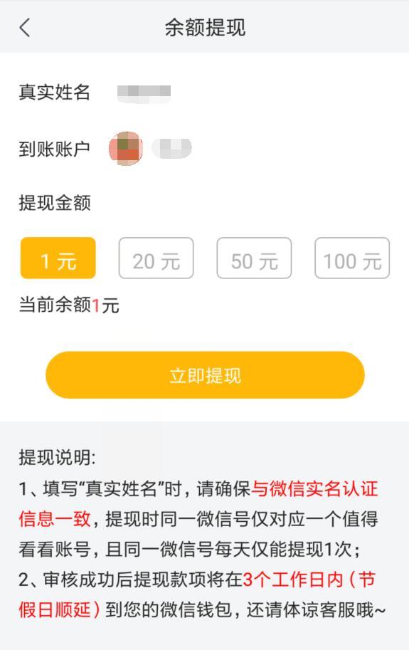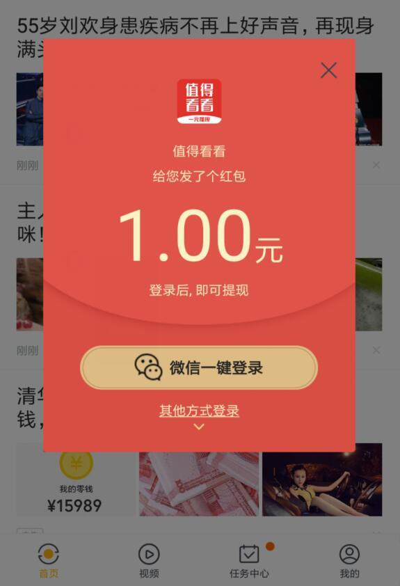 点链接,下载值得看看APP,进入后,点微信一键登录,如果登录不了,点我的,再点微信。登陆后,得1元零钱红包,先绑定手机号,然后点零钱1元,点提现,填真实姓名,需与微信实名认证信息一致,点到账账户,绑定微信,提现金额选1元,点立即提现,3个工作日内到账微信钱包。感谢 不可笑哦 提供。