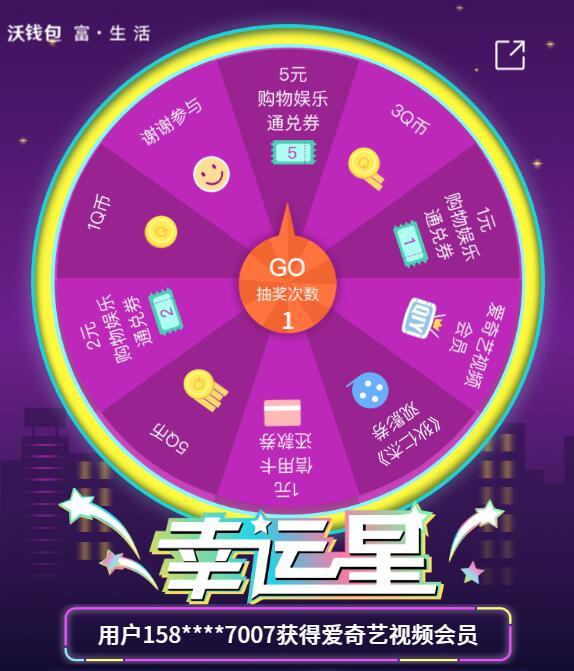 进入活动页面,点链接,全体用户均可免费获得1次抽奖机会,点GO抽奖机会,可以抽奖,小希中了一张1元购物娱乐通兑券。购物娱乐通兑券可在沃钱包APP或联通手机营业厅-我的-我的钱包中的淘票票电影、京东商城、网易严选、丝芭商城场景消费时抵扣使用。还有机会获得Q币,爱奇艺视频会员。