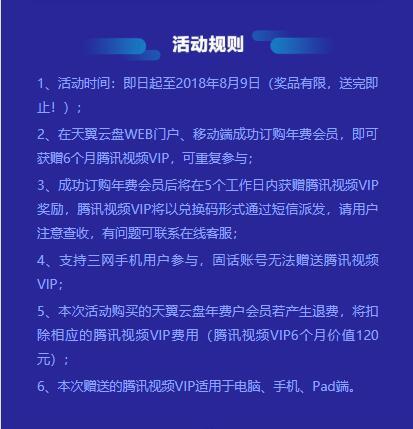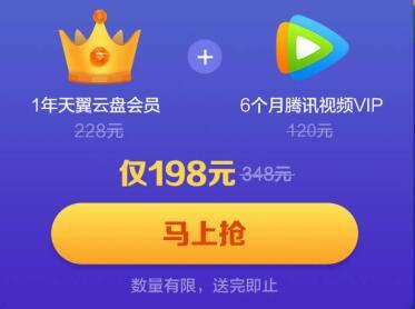 点链接,点马上抢,可以以1年198元的价格购买1年天翼云盘会员+6个月腾讯视频VIP会员(原价348元,现价198元),腾讯视频VIP以兑换码形式短信派发,订购年费会员后5个工作日后发放,支持三网手机用户参与,固话帐号无法赠送腾讯视频VIP,本次活动若用户退费,将扣除相应的腾讯视频VIP费用。