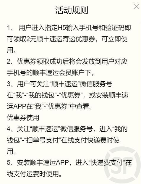 点链接,输入手机号和验证码,可领取2元顺丰速运寄件优惠券。优惠券领取成功将会发放到用户对应手机号的顺丰速运会员账户下。可关注“顺丰速运”微信服务号,在我的,我的钱包,优惠券中查看,进入我的钱包,扫单号支付可使用优惠券。本优惠券由福妈妈和顺丰速运提供。