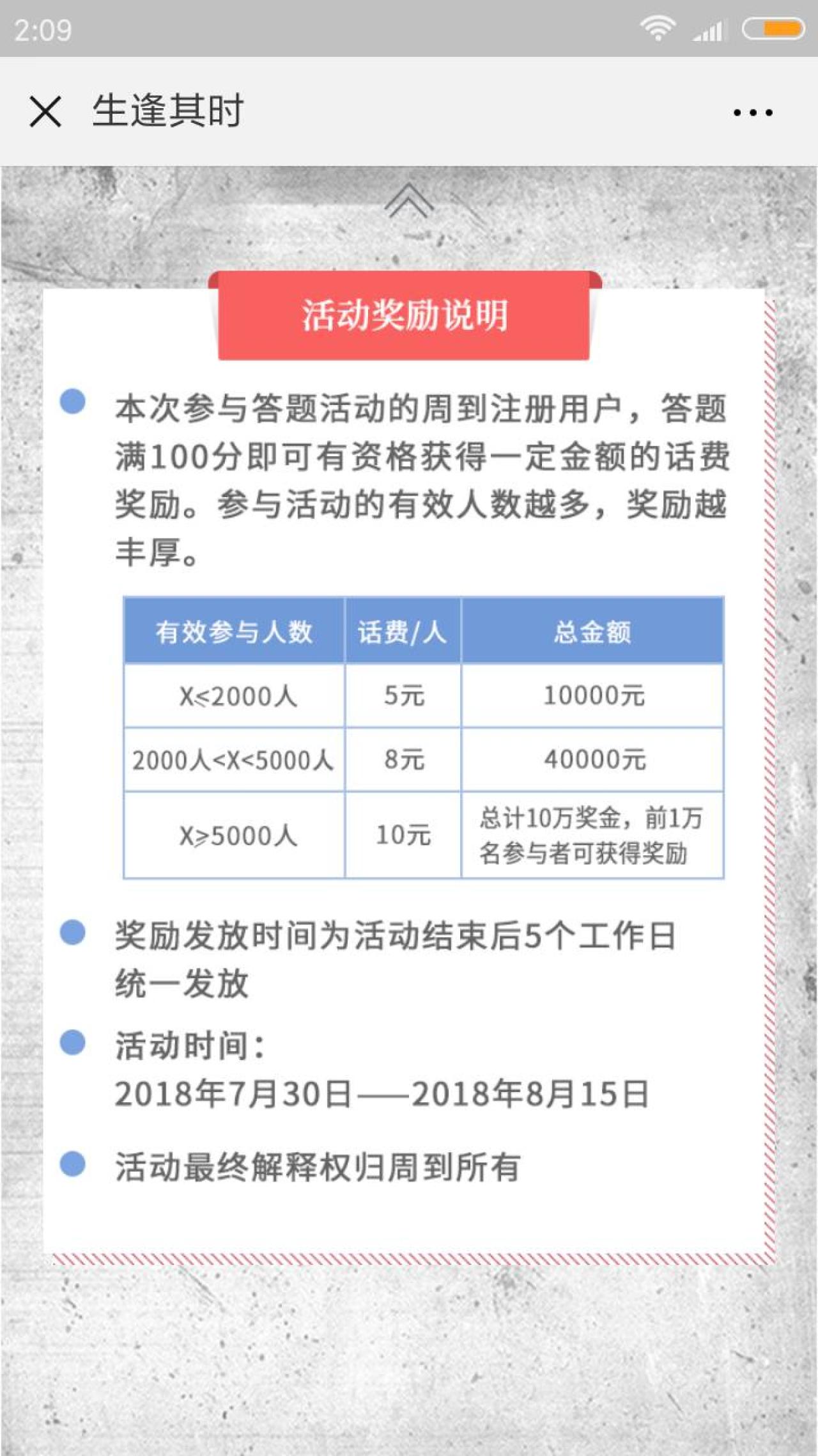只有前1万名参与者有奖励,请尽快参与,过期答题就没有奖励啦!话费将在活动结束后,5个工作日内发放。