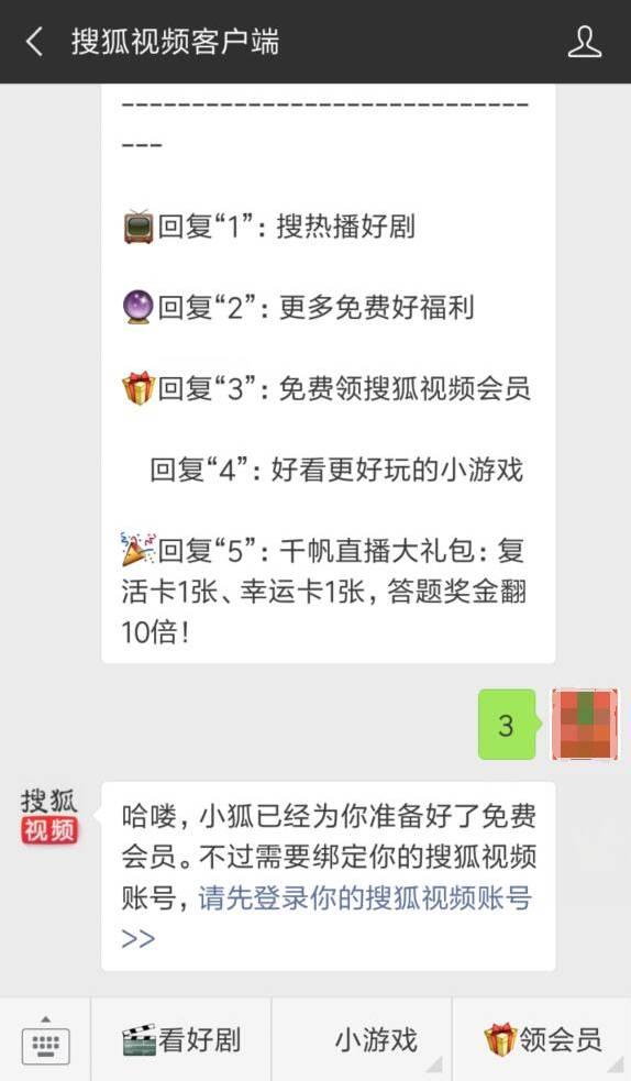 进入微信,点右上角+,添加朋友,公众号,搜索 搜狐视频客户端,关注后,回复3,点 请先登录你的搜狐视频帐号,输入手机号和密码,登录后,即可获得3天搜狐视频会员VIP,除了客户端,电脑端和移动端也可用。可以观看会员专享影片,跳过广告,蓝光画质等特权。