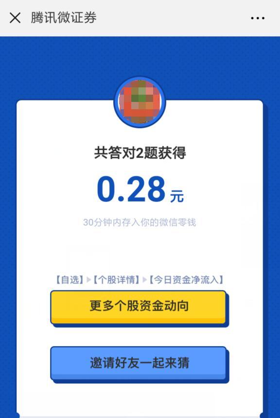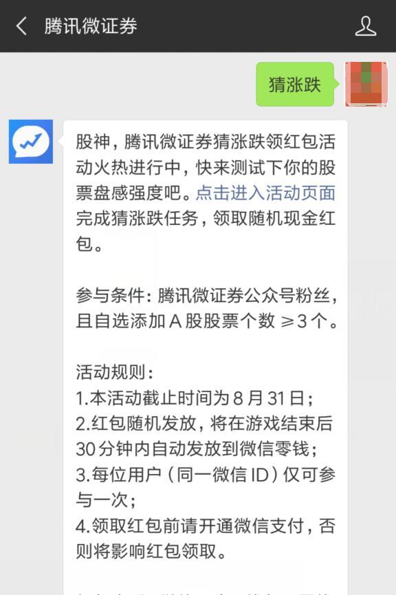 进入微信,点右上角+,添加朋友,公众号,搜索 腾讯微证券,关注后,回复 猜涨跌,点击进入活动页面,根据提示,任意点击3个股票,每个股票点进去后,点 +自选 按钮。然后,进行猜涨跌游戏,可以猜三次,如果不懂股票,可以全猜涨 或 全猜跌。小希对了2次,得了0.28元现金红包,到账微信零钱,可提现。