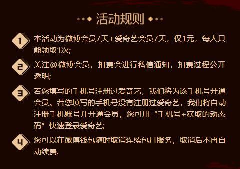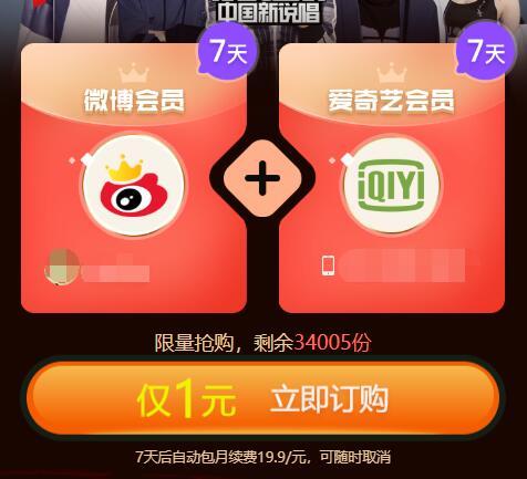 点链接,可以1元同时开通新浪微博会员7天+爱奇艺会员7天,每个人只能订一次,7天后自动包月续费,19.9元,不需要请提前取消自动续费!同时享受新浪微博会员和爱奇艺会员权益。订购前,请核对微博帐号和爱奇艺手机号,如果手机号不正确,请先在微博设置中,更改绑定的手机号与爱奇艺一致。