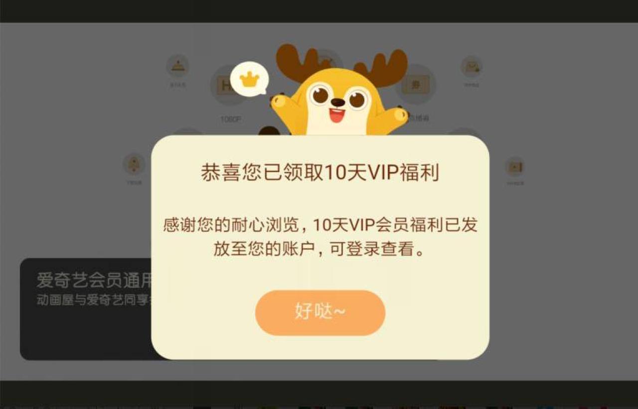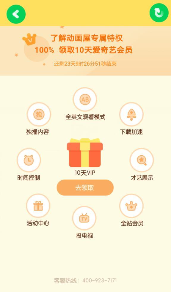 点链接,下载爱奇艺奇巴布(原爱奇艺动画屋),进入后,点VIP会员专享,点免费领,去领取按钮,观看爱奇艺VIP动画屋专属特权的介绍,观看完成后,即可领取10天爱奇艺黄金VIP,可以享受爱奇艺全站免广告,1080P,会员专属影片和剧集,以及爱奇艺奇巴布的独播内容,全英文观看模式,时间控制等功能。