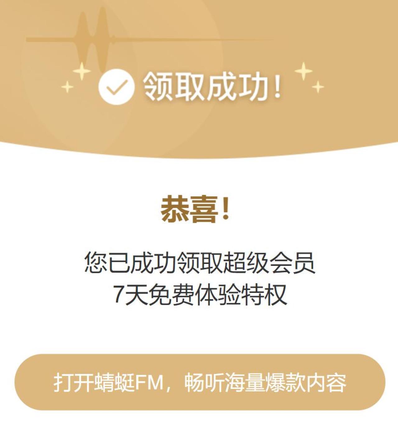 点链接,下拉到页面中部,点免费领取,登录或者注册蜻蜓FM帐号,返回后,再点 免费领取,可领取 蜻蜓FM超级会员 7天免费体验特权。与充值的超级会员特权相同,包括 免广告,全场7000+小说,2000+出版物畅听,大咖付费专辑8.8折,购买付费专辑大额神券,独享热门番外和新书。