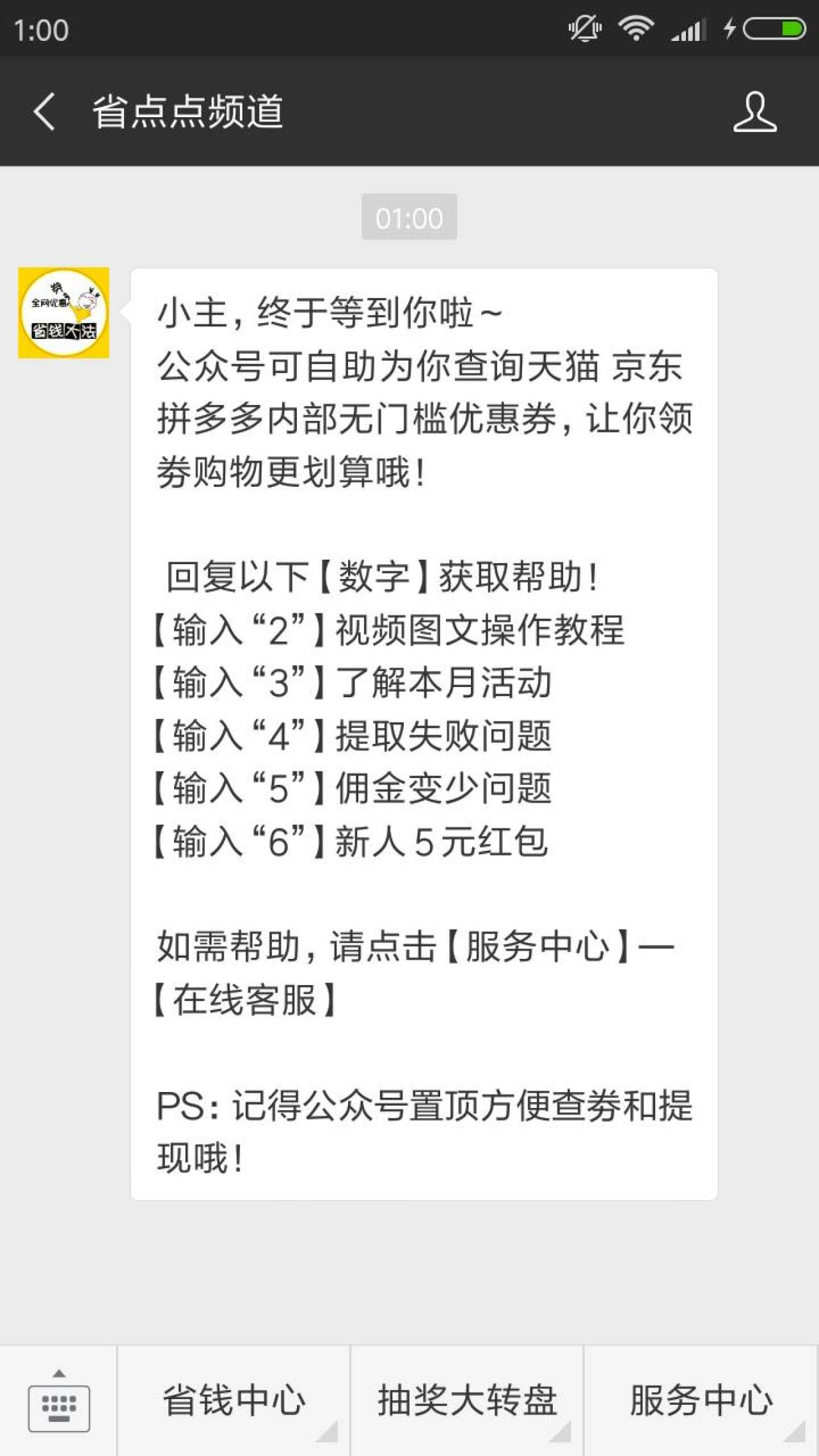 进入微信,点右上角+,添加朋友,公众号,搜索 省点点频道,关注后,点 抽奖大转盘,进入后,可抽奖2次。小希抽中了现金红包,点领取红包,输入手机号和验证码,提交后,点领取,收到服务消息,从消息中拆开红包。小希获得了1元。