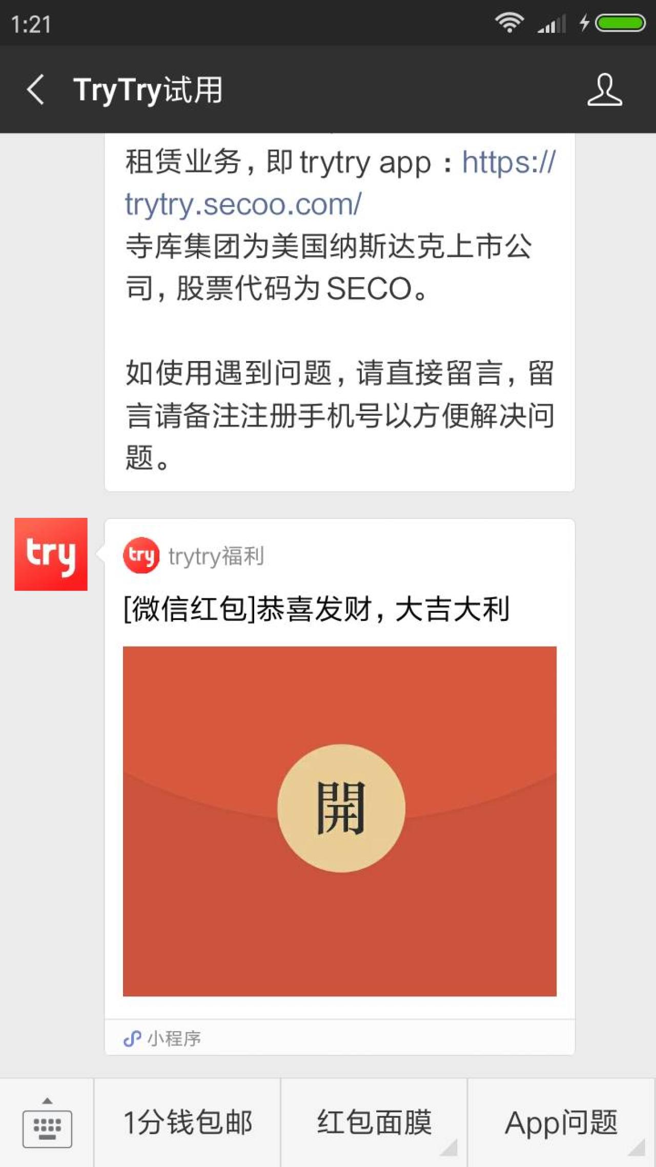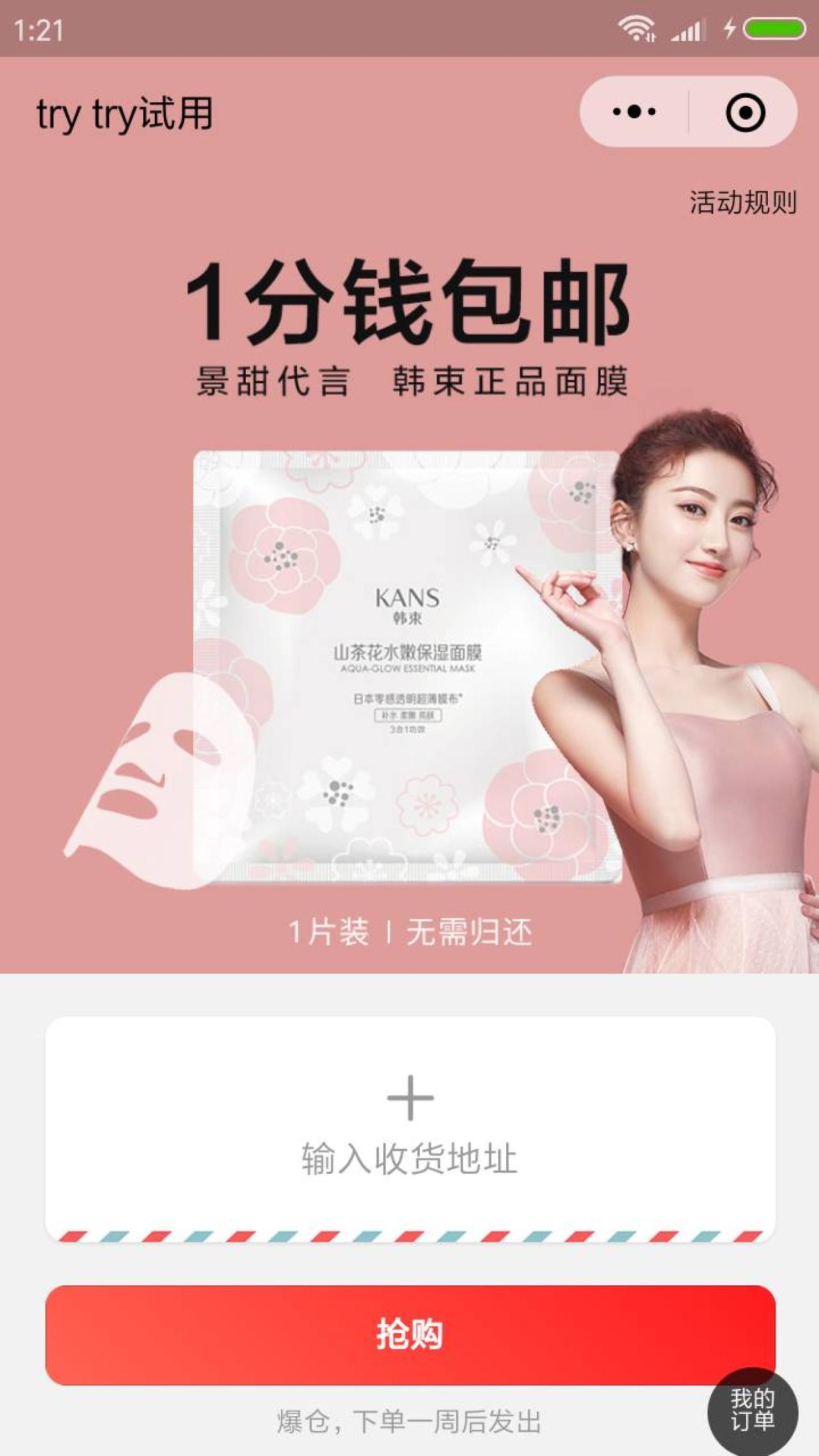 进入微信,点右上角搜索 TryTry试用,点左下角的 1分钱包邮,输入收货地址,支付0.01元,可获取由景甜代言的山茶水嫩保湿面膜,1片状,无需归还哦。领取后,分享到微信群,下周还可以再领哦!数量有限,先到先得!小希上次领的面膜已经邮到了,1分钱包邮棒棒哒~