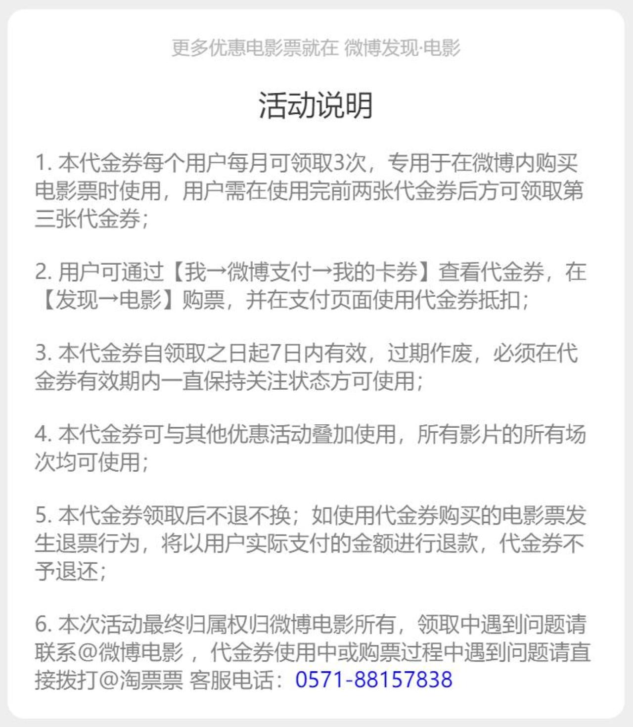 点链接,点关注领取,可领取10元电影代金券,本代金券每个用户可领取3次,专用于在微博内购买电影票时使用,用户需在使用完前两张代金券后方可领取第三章代金券。领取后可在我,微博支付,我的卡券查看代金券,在发现,电影中购票,并在支付页面使用代金券抵扣。代金券自领取之日起7日内有效。