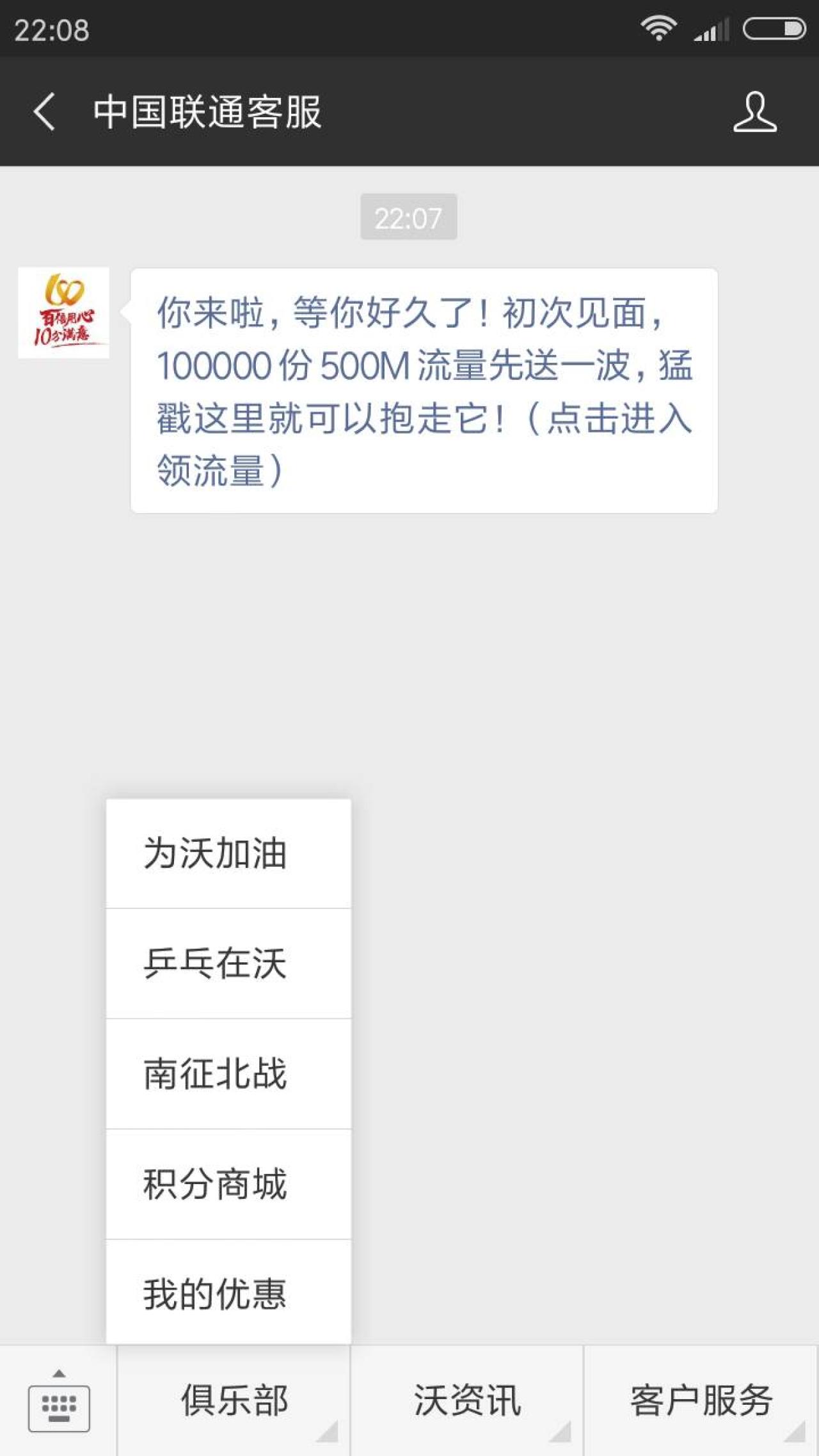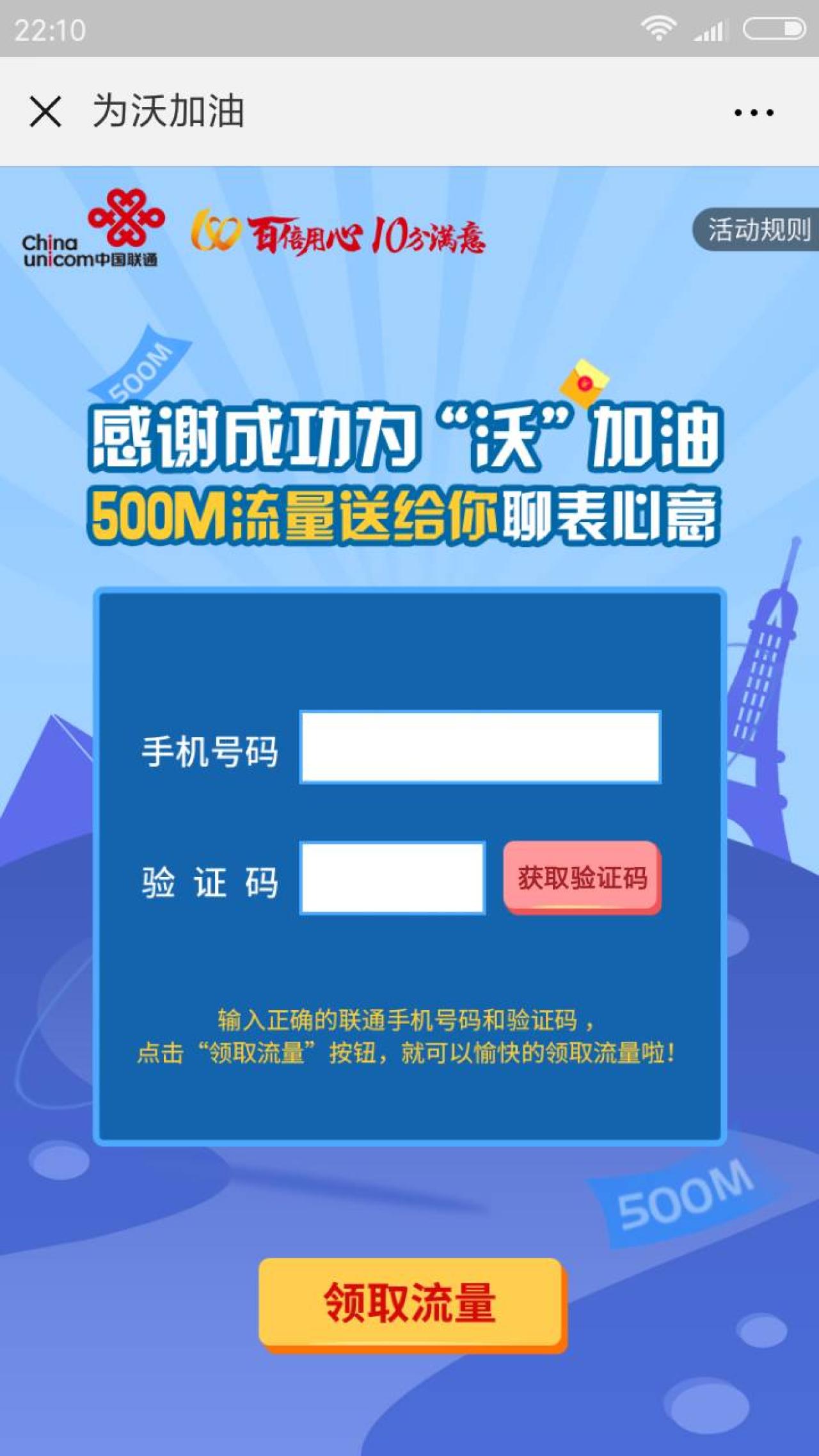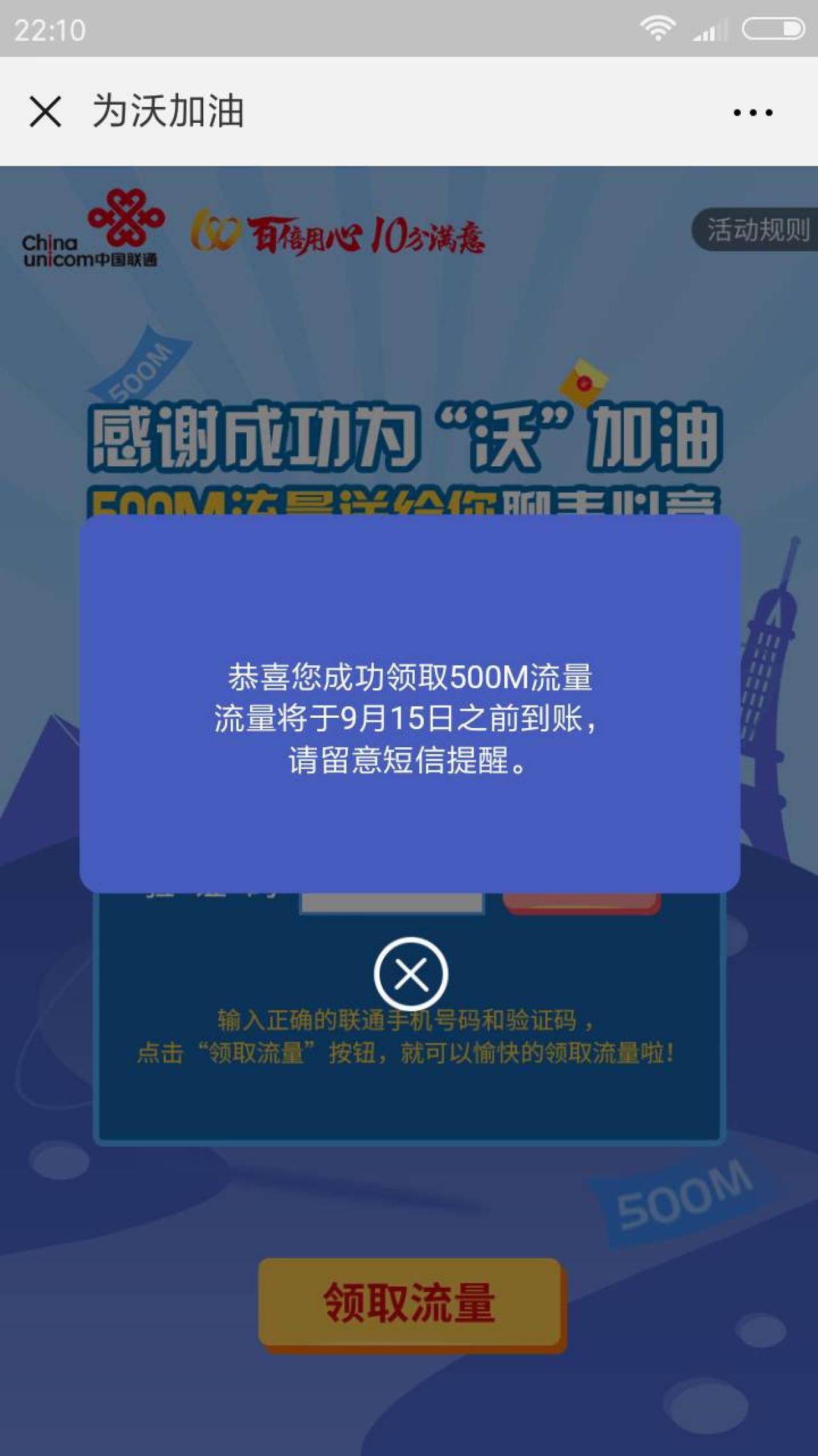 进入微信,点右上角+,添加朋友,公众号,搜索 中国联通客服,关注后,点左下角 俱乐部,为沃加油,进入后,点击加油,点右上角,发送给朋友,将活动发送给任意好友(可以同一好友多次)5次,返回点领取流量,输入手机号和验证码,即可领取500M流量,流量将于9月15日之前到账,请留意短信提醒。